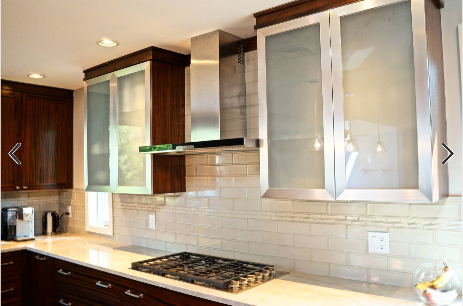 2. African Ribbon Mahogany is Naturally Dark. Notice the modern style crown molding, Island Corbels and Stainless Steel accents.