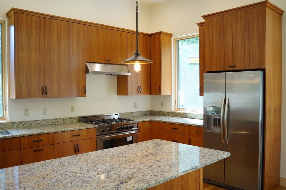 7. Ribbon Mahogany Kitchen with Flat Slab Doors and Full Overlay Style. Includes a Built-in Pantry