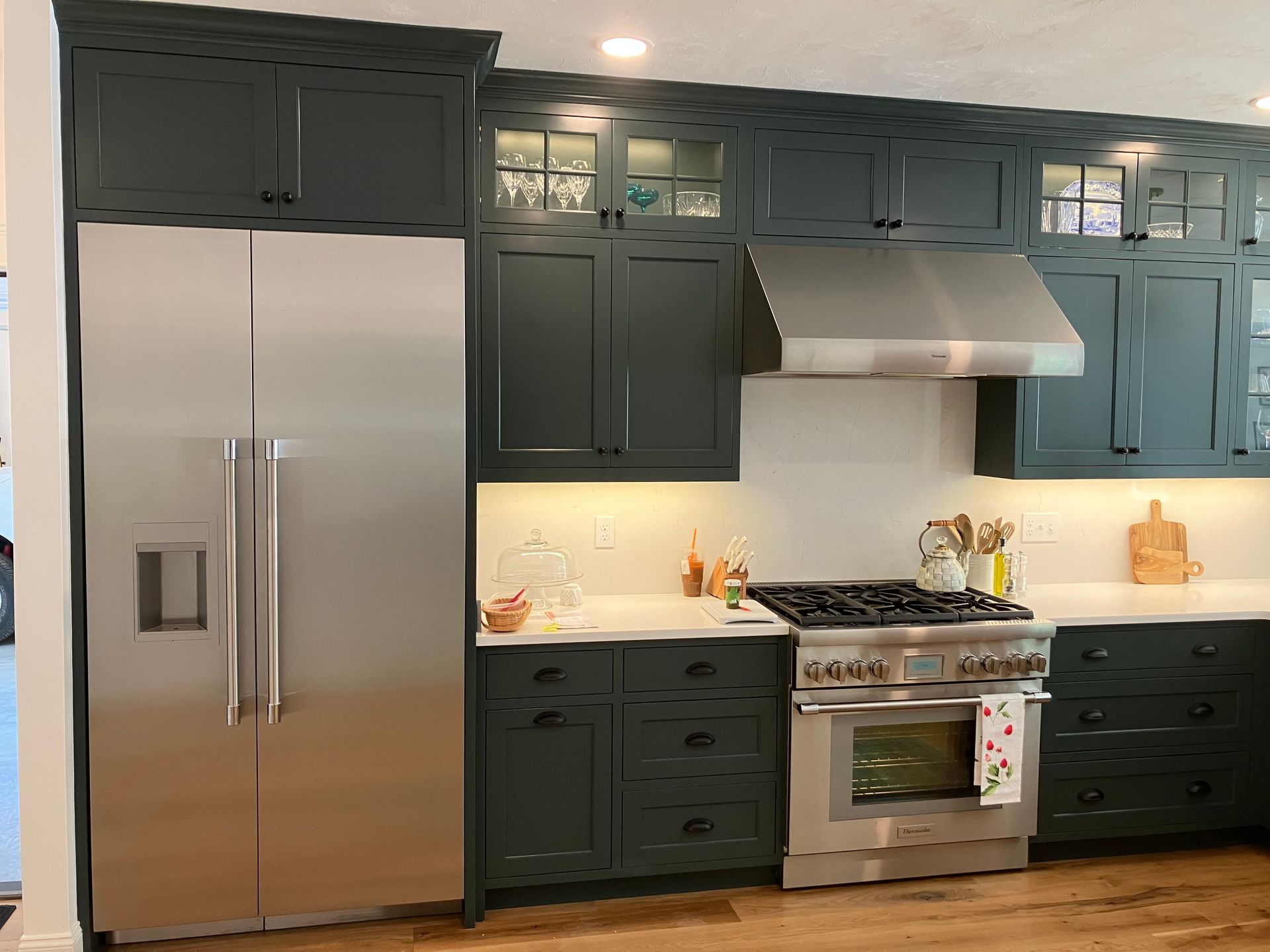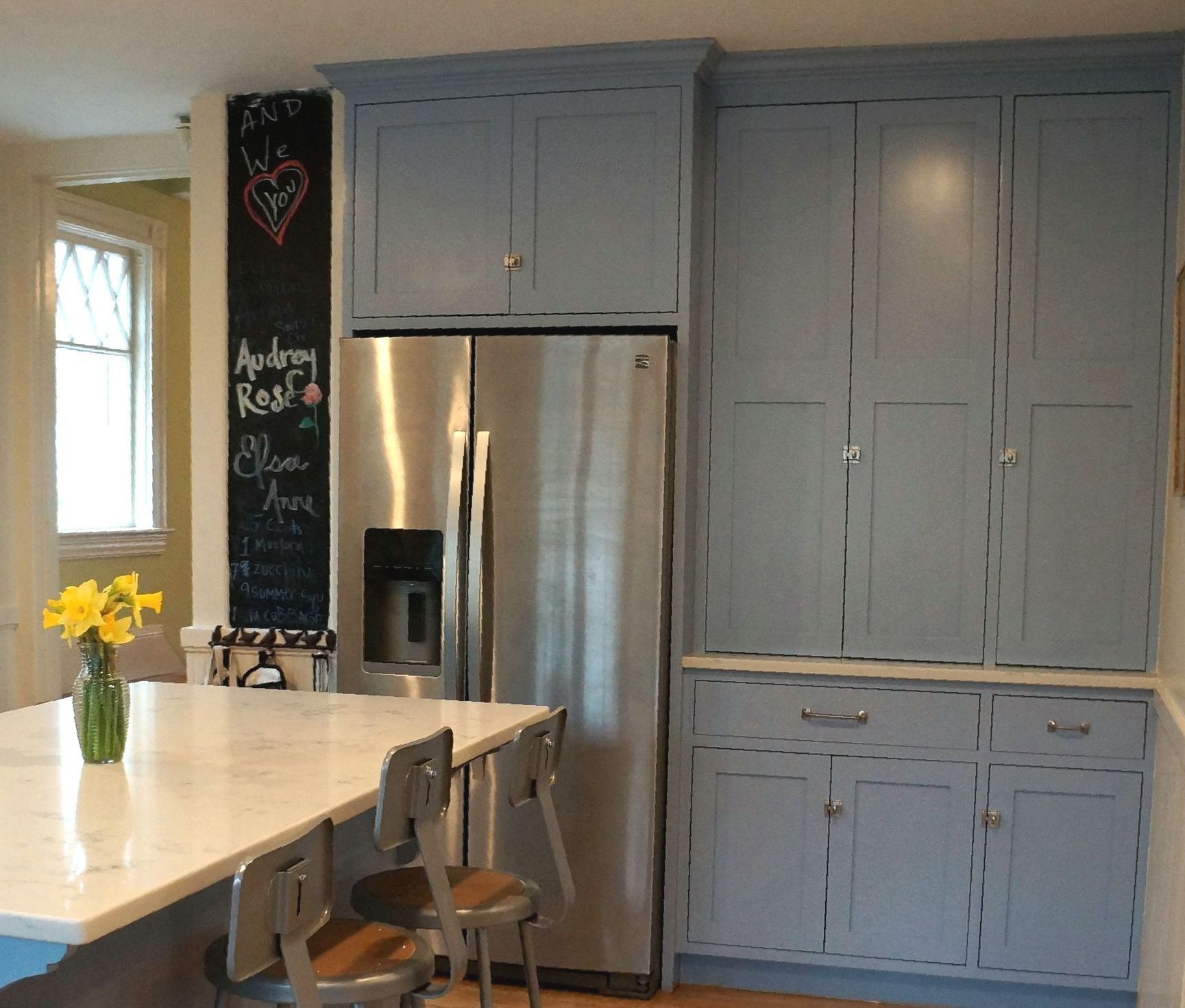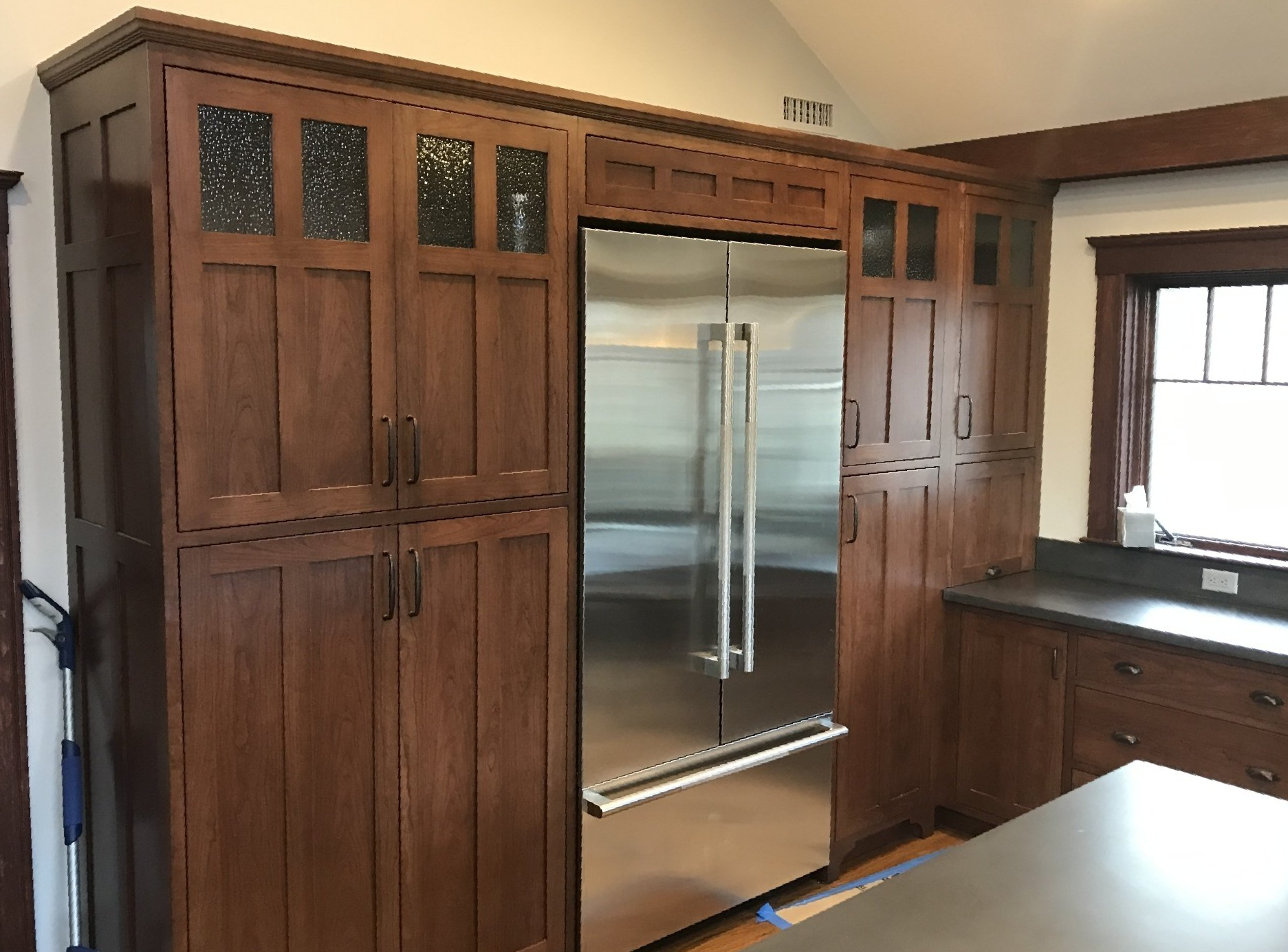 9. Craftsman Style Kitchen with Hammered Glass Doors, tri-panel sides, and Stained Cherry Wood. Quincy MA