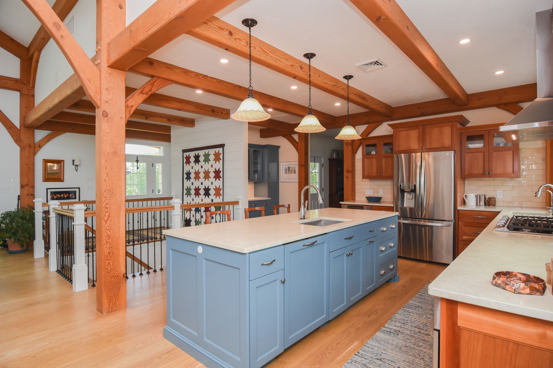 5. A Lovely Post & Beam Home in Natural Cherry with Blue accents. Ashburnham, MA