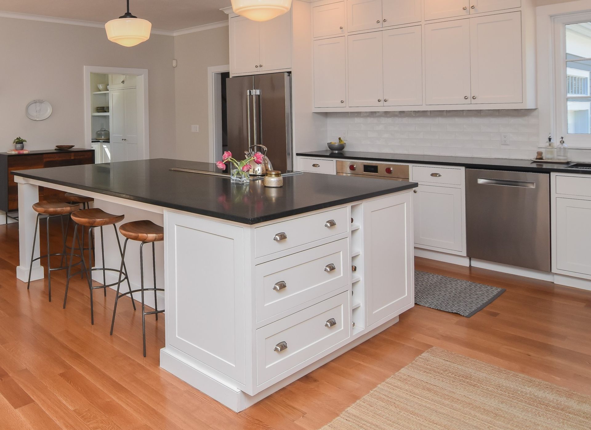 1. This Spacious Kitchen includes a Butler's Pantry, a Beverage Station and Bookcase open to the livingroom. The Large Island Seats five and includes a cooktop with warming drawer and lots of great storage ideas. Bolton MA.