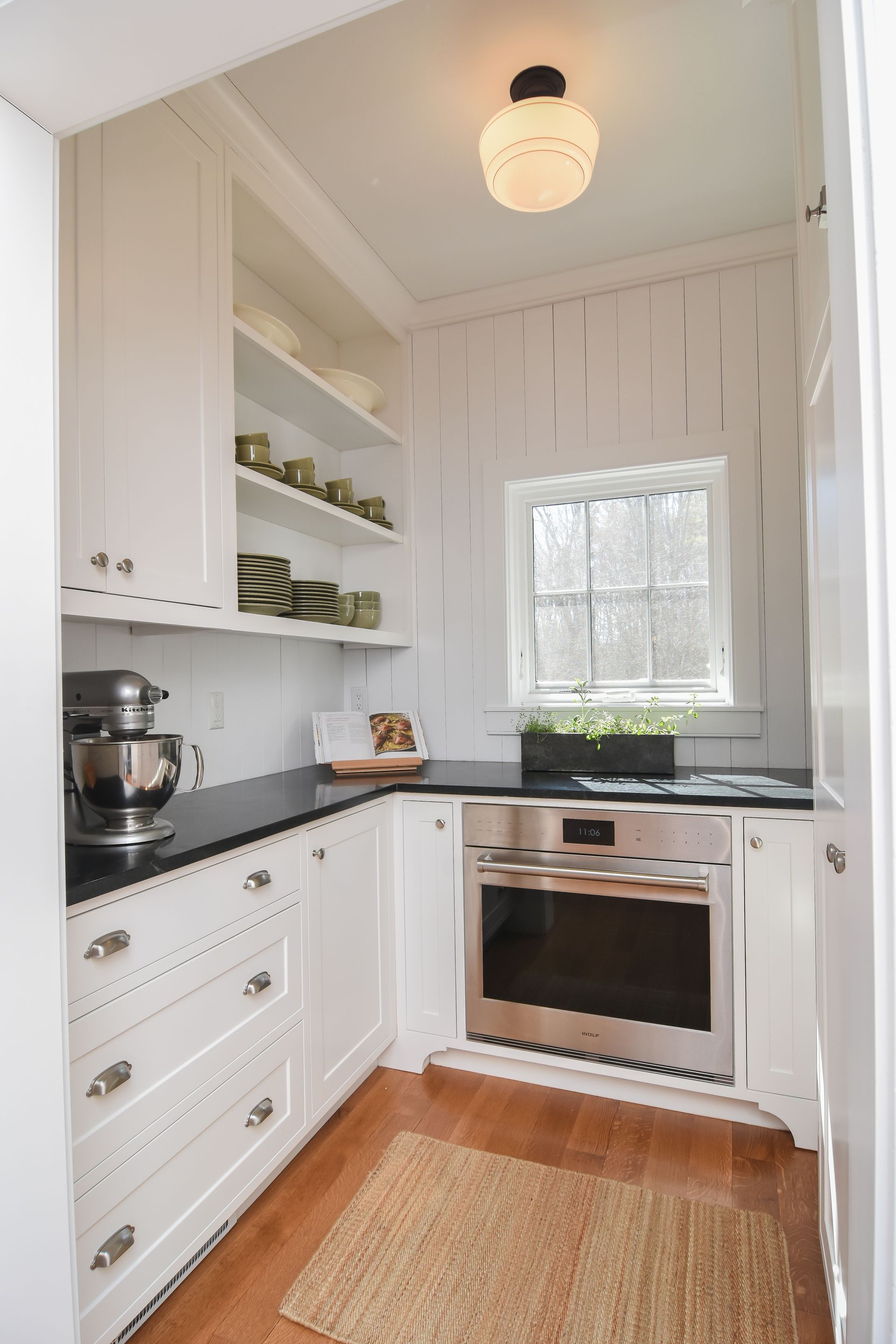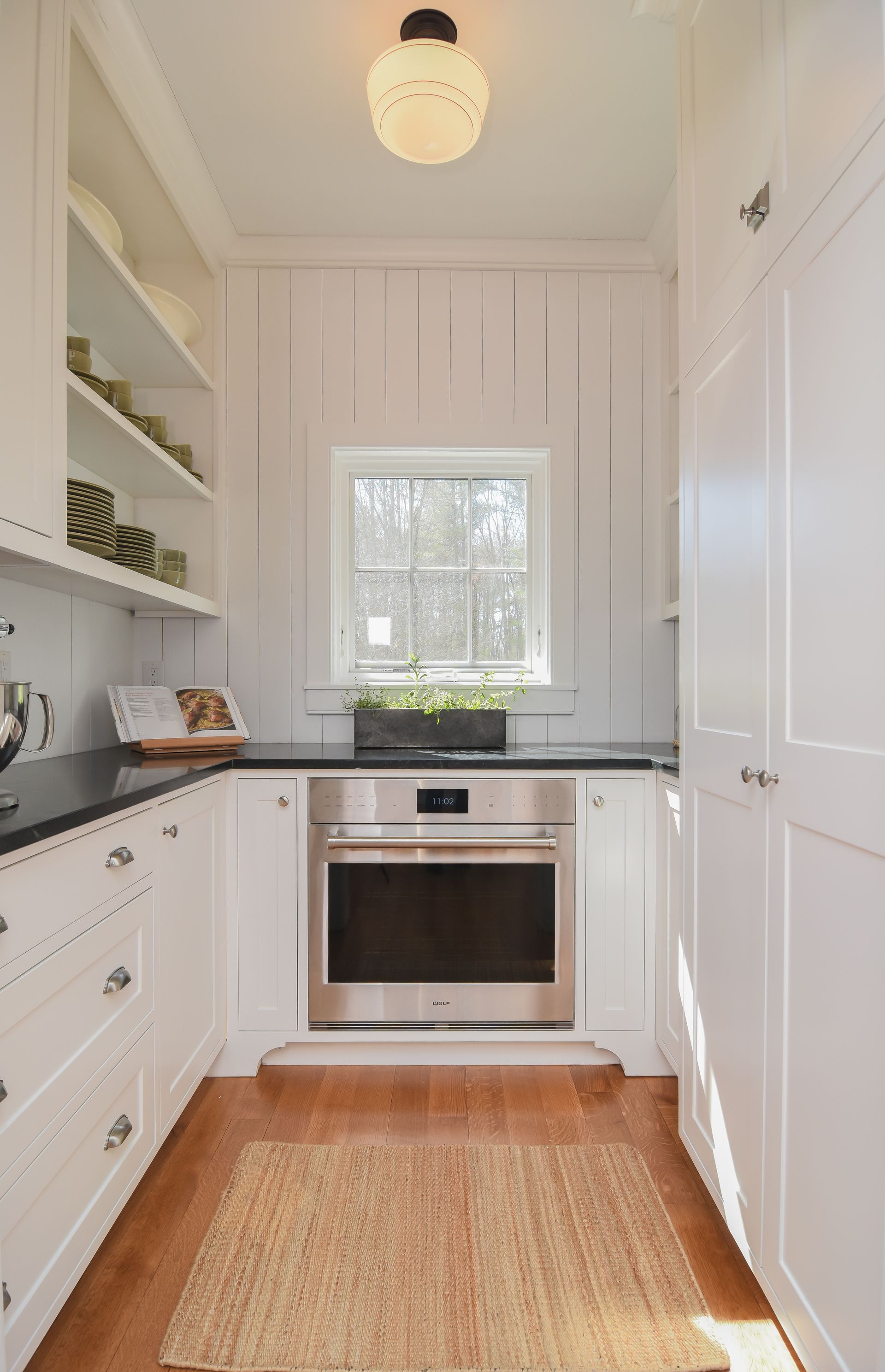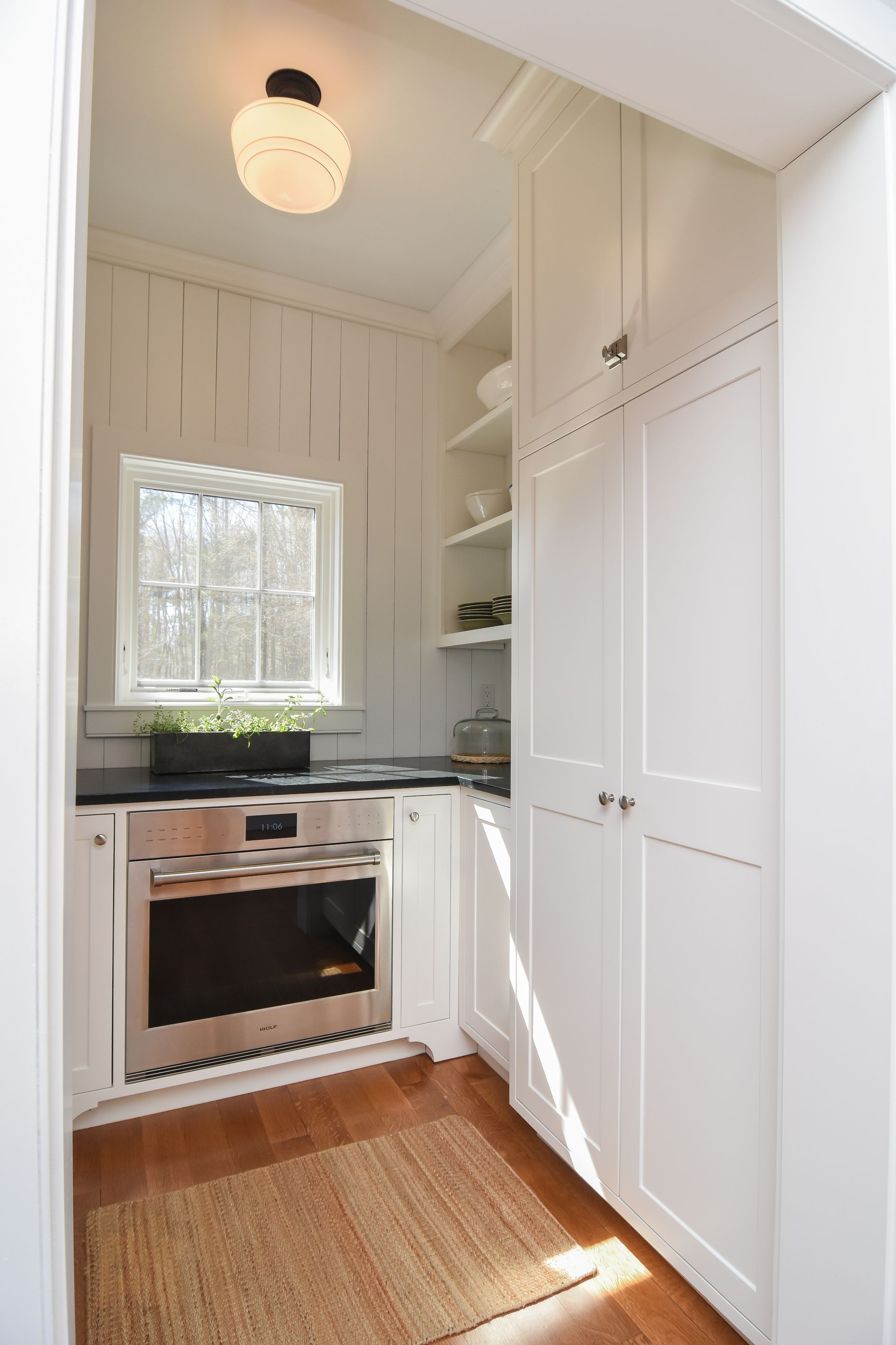 The Butler's Pantry has storage in every corner of the space, including cookie sheet cabinets on each side of a second oven, and a designated broom closet space in a split pantry cabinet.
