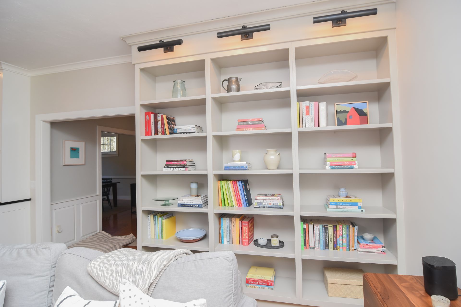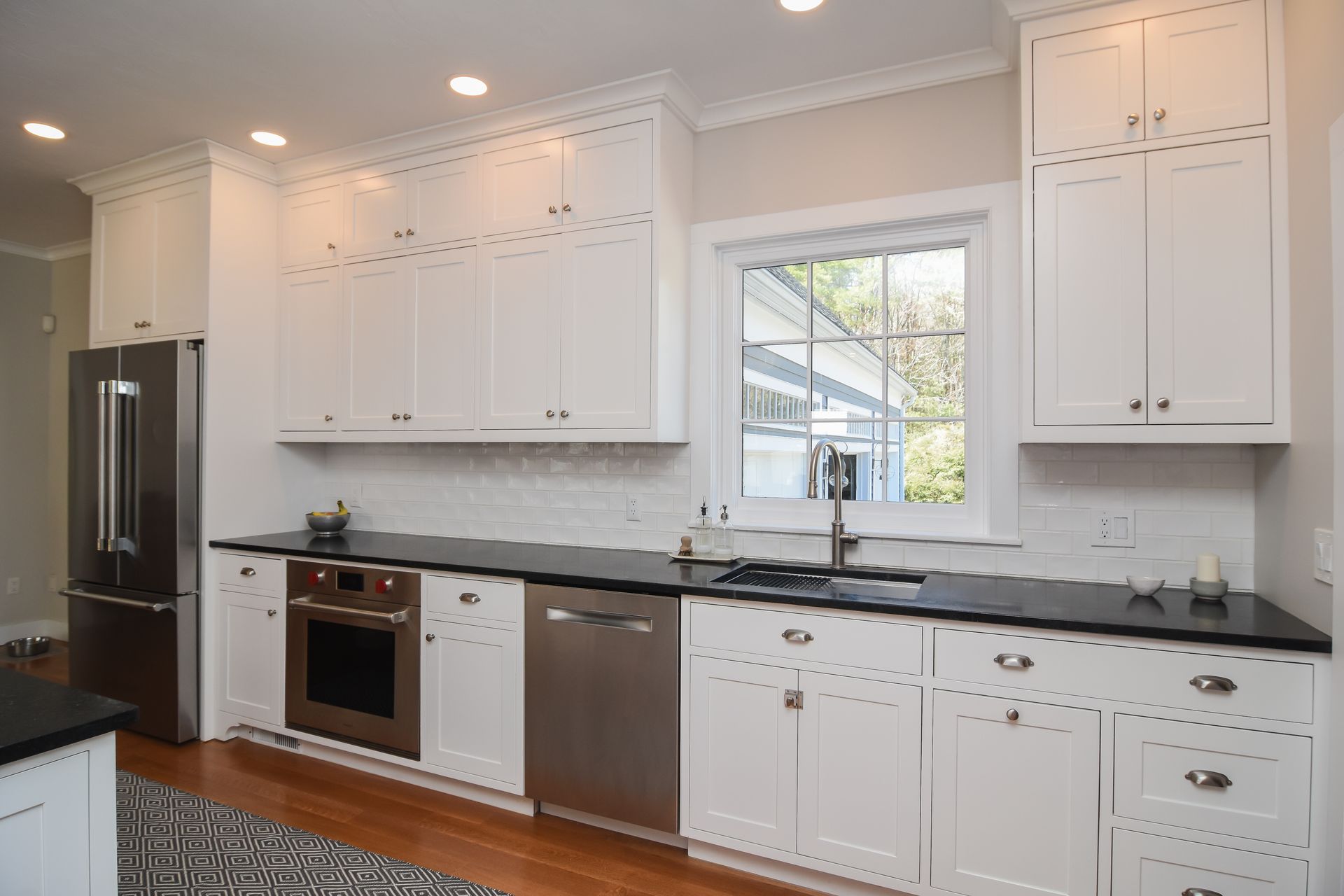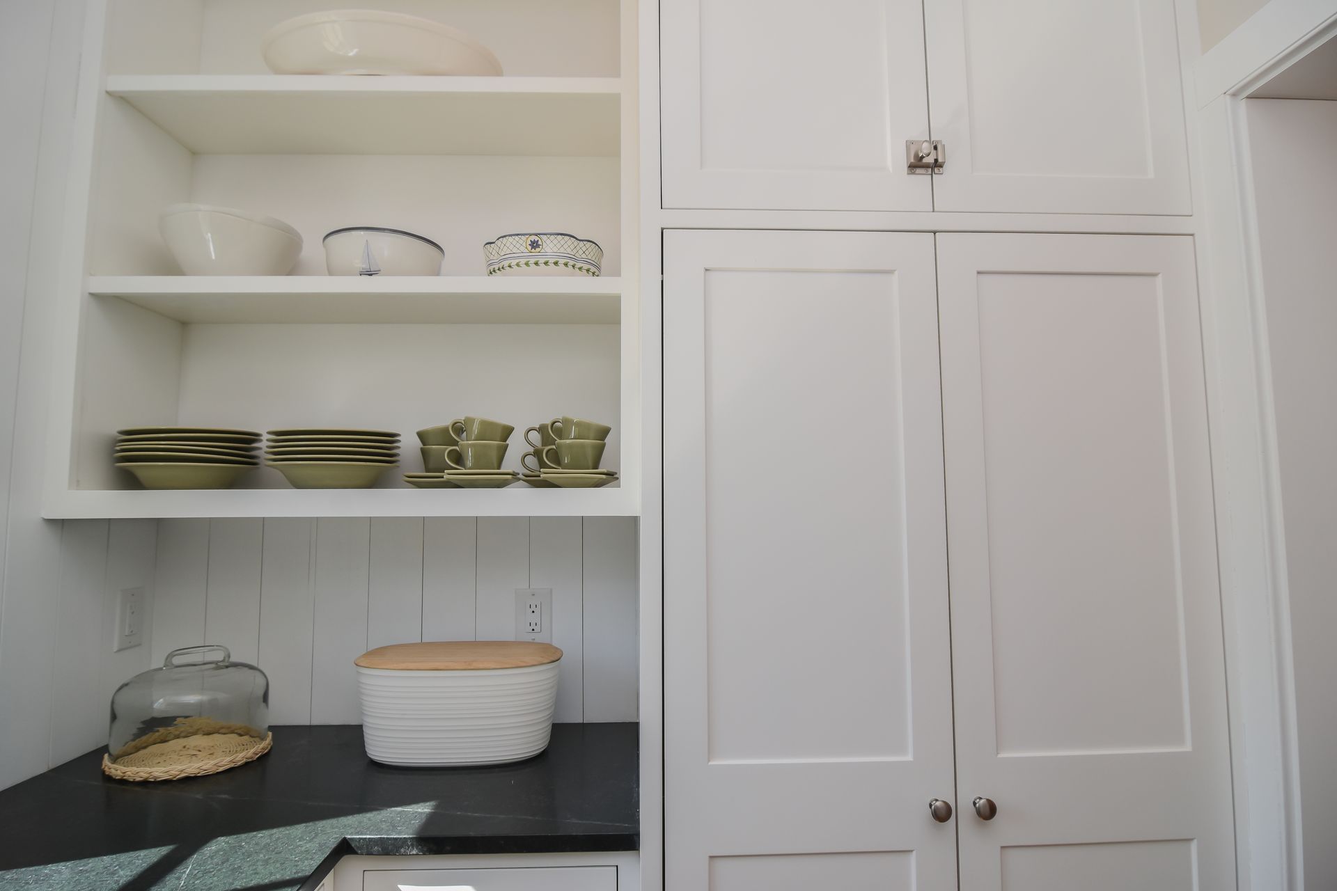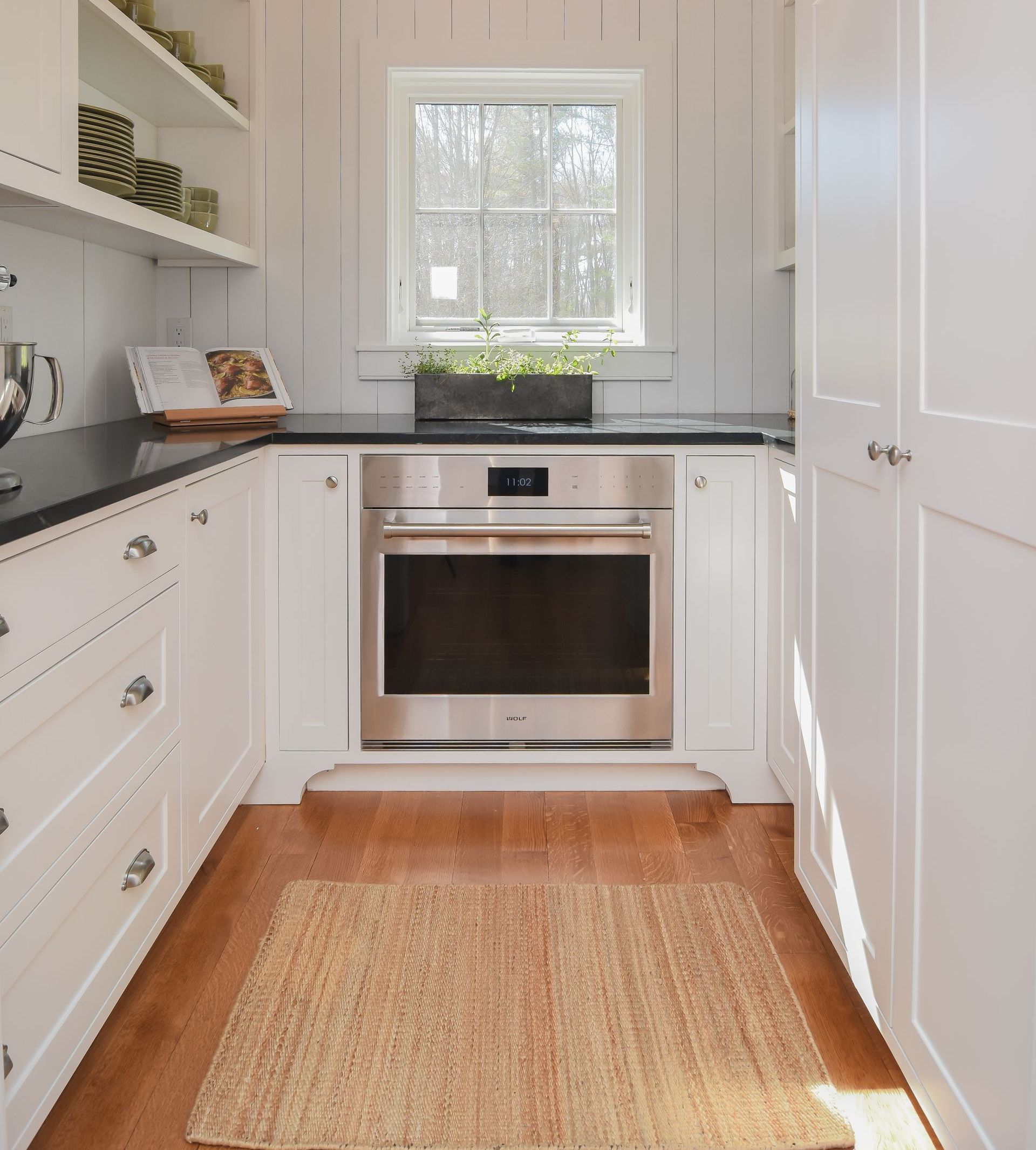 The Butler's Pantry has storage in every corner of the space, including cookie sheet cabinets on each side of a second oven, and a designated broom closet space in a split pantry cabinet.