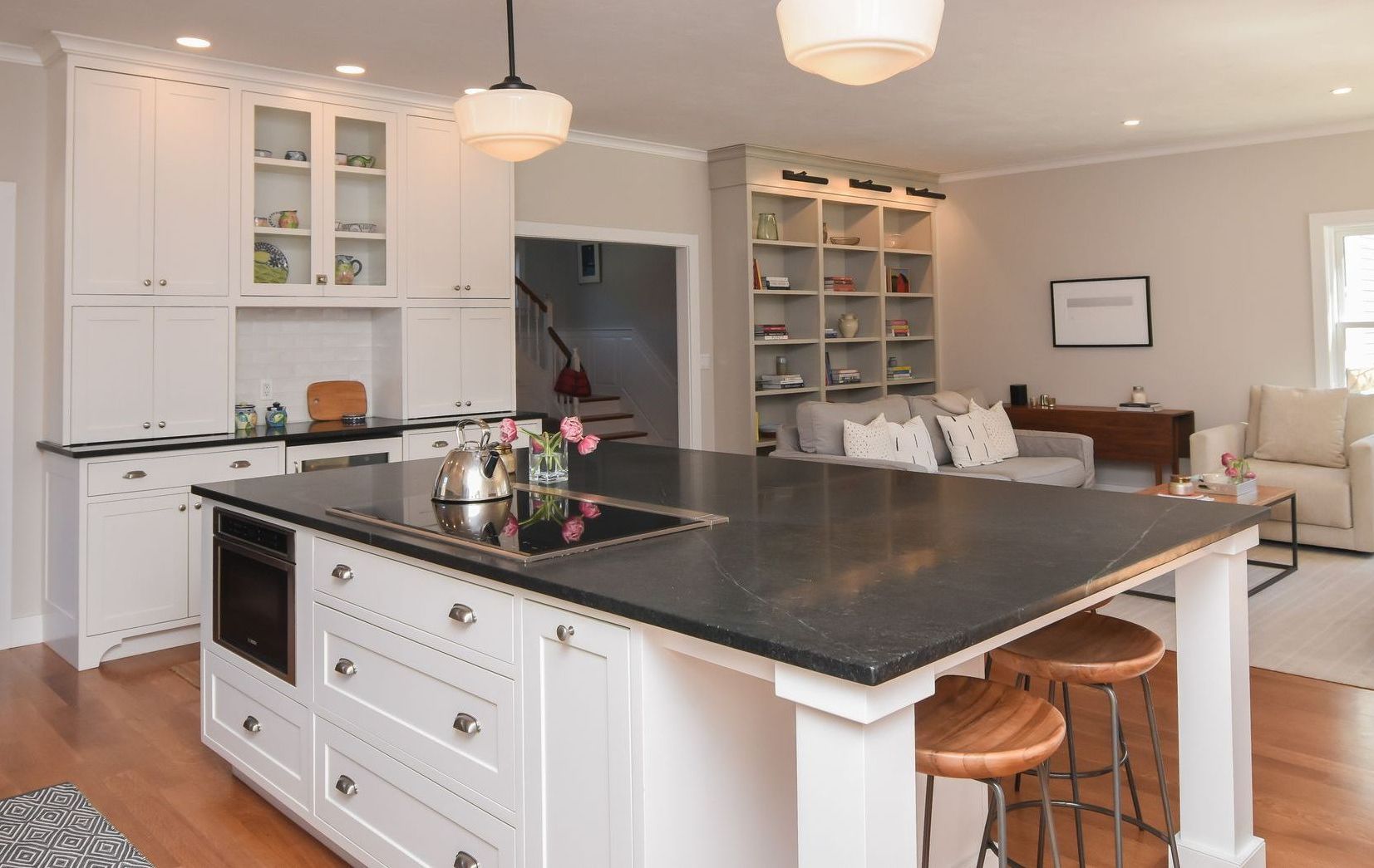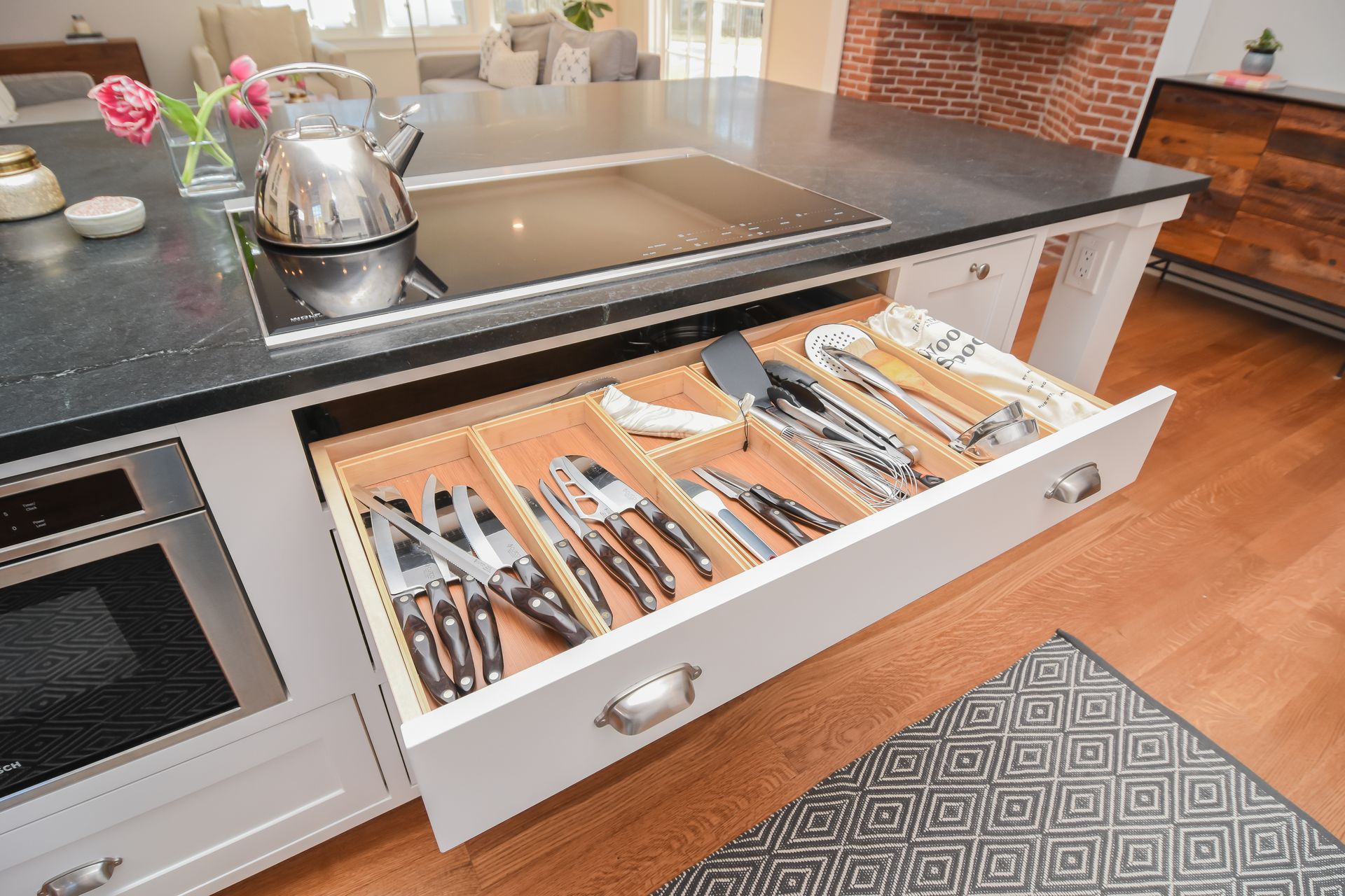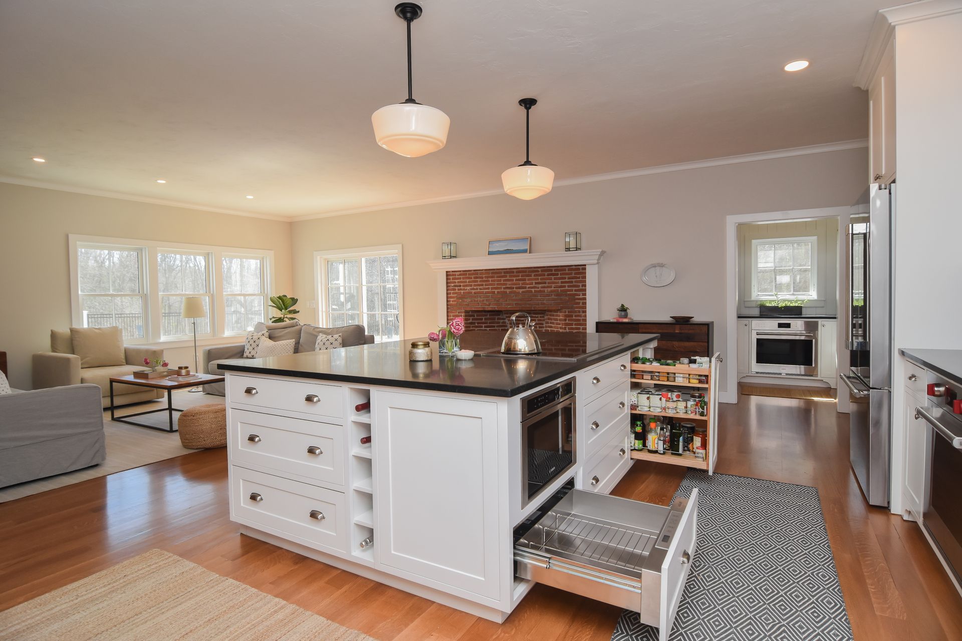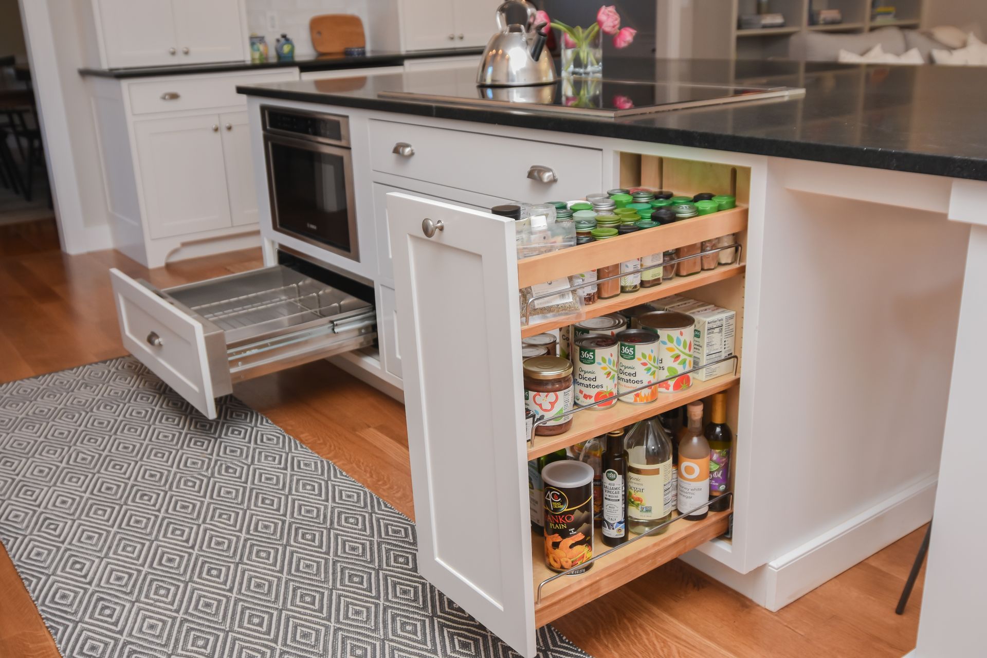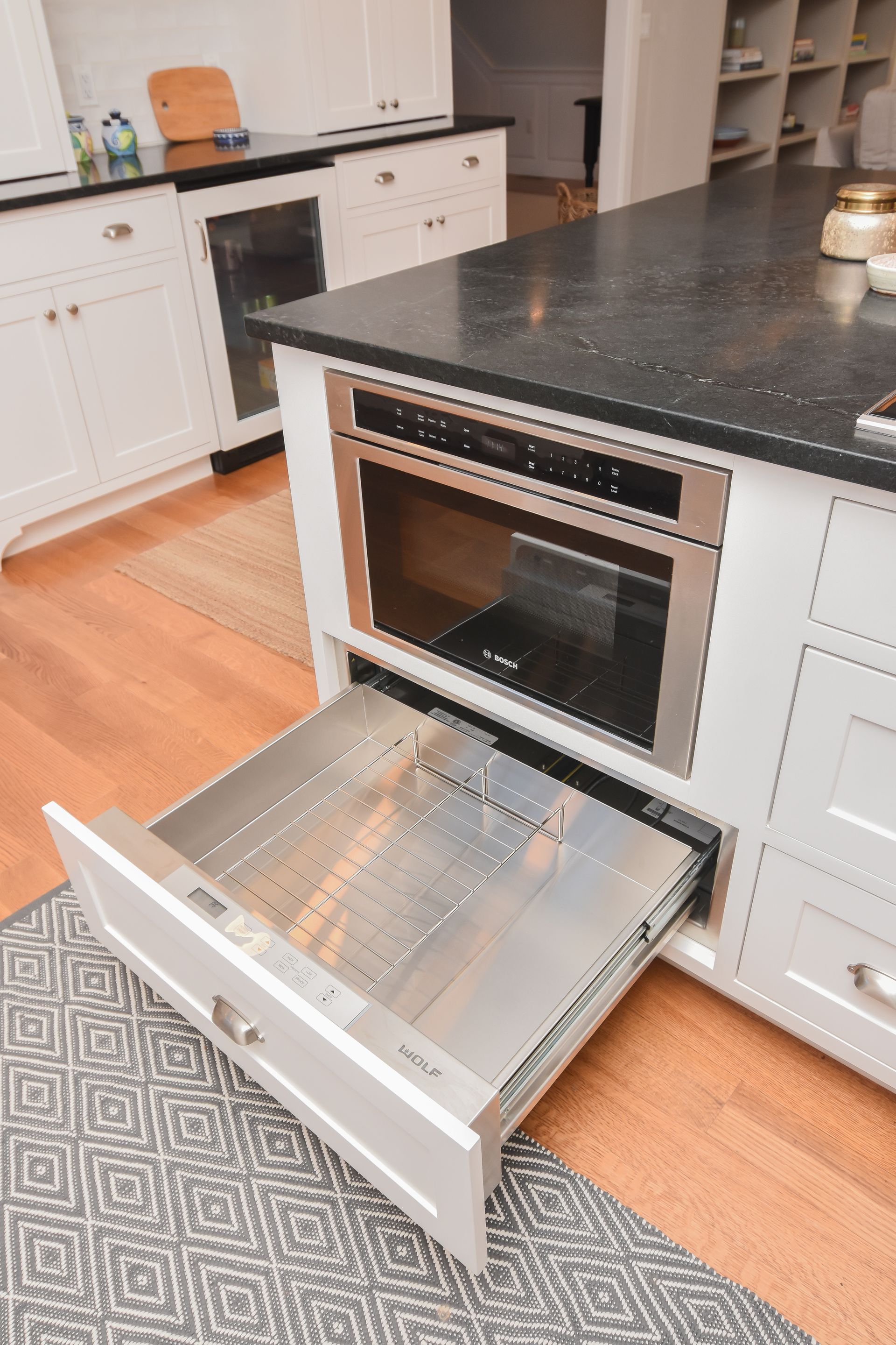 This large Island seats five and includes a Cooktop with Warming drawer, Microwave, a 12" Oil Pullout.
