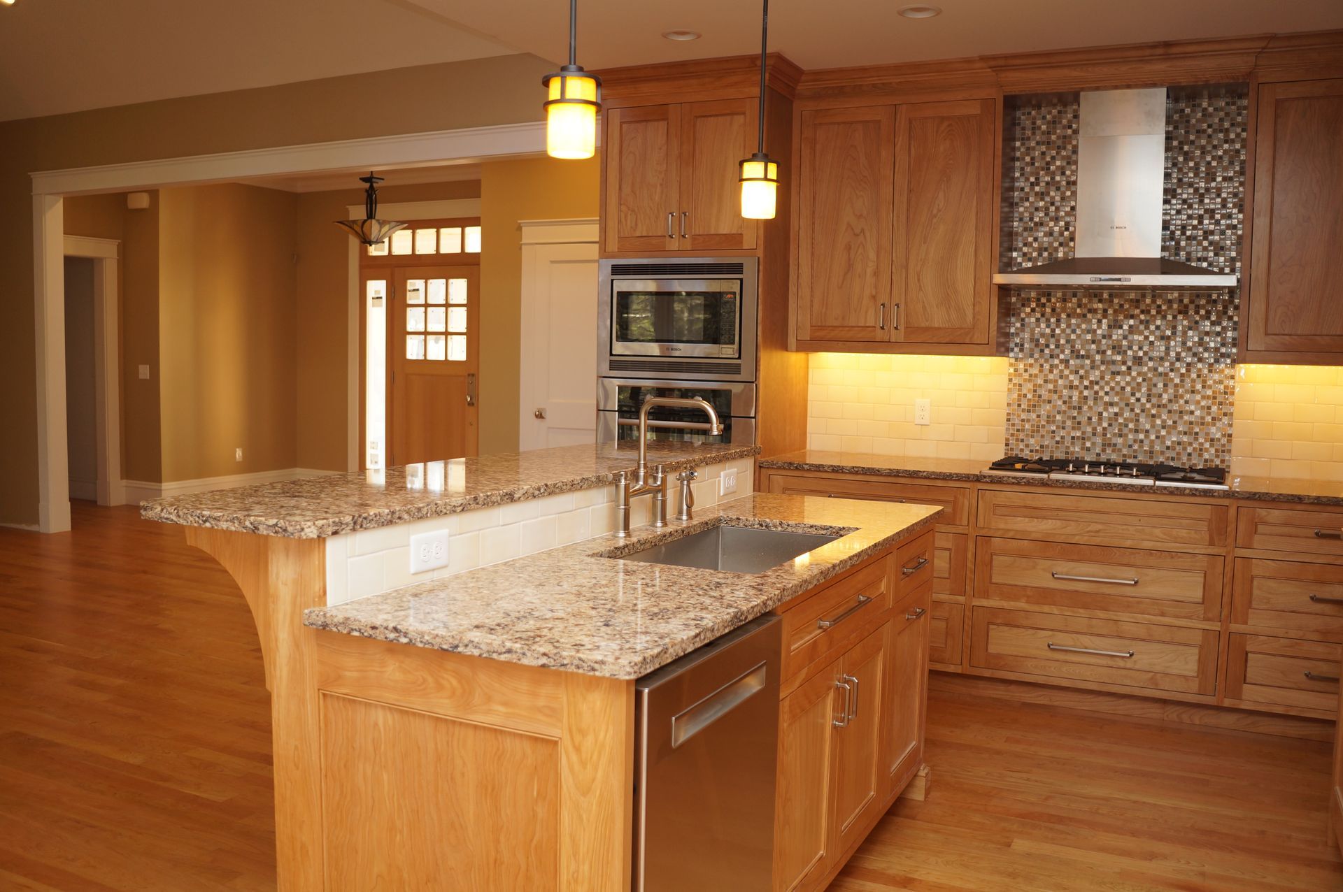 What gives this kitchen a "Transitional" look, is the full overlay style, the stainless chimney hood, the wide pulls on drawers, and the style of the pendant lights as well as the framed top drawers.