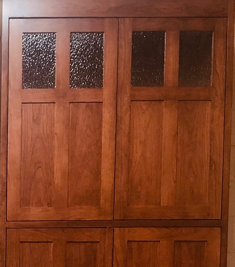 4 Panel Doors with Hammered Glass and Flat Slab Drawers.