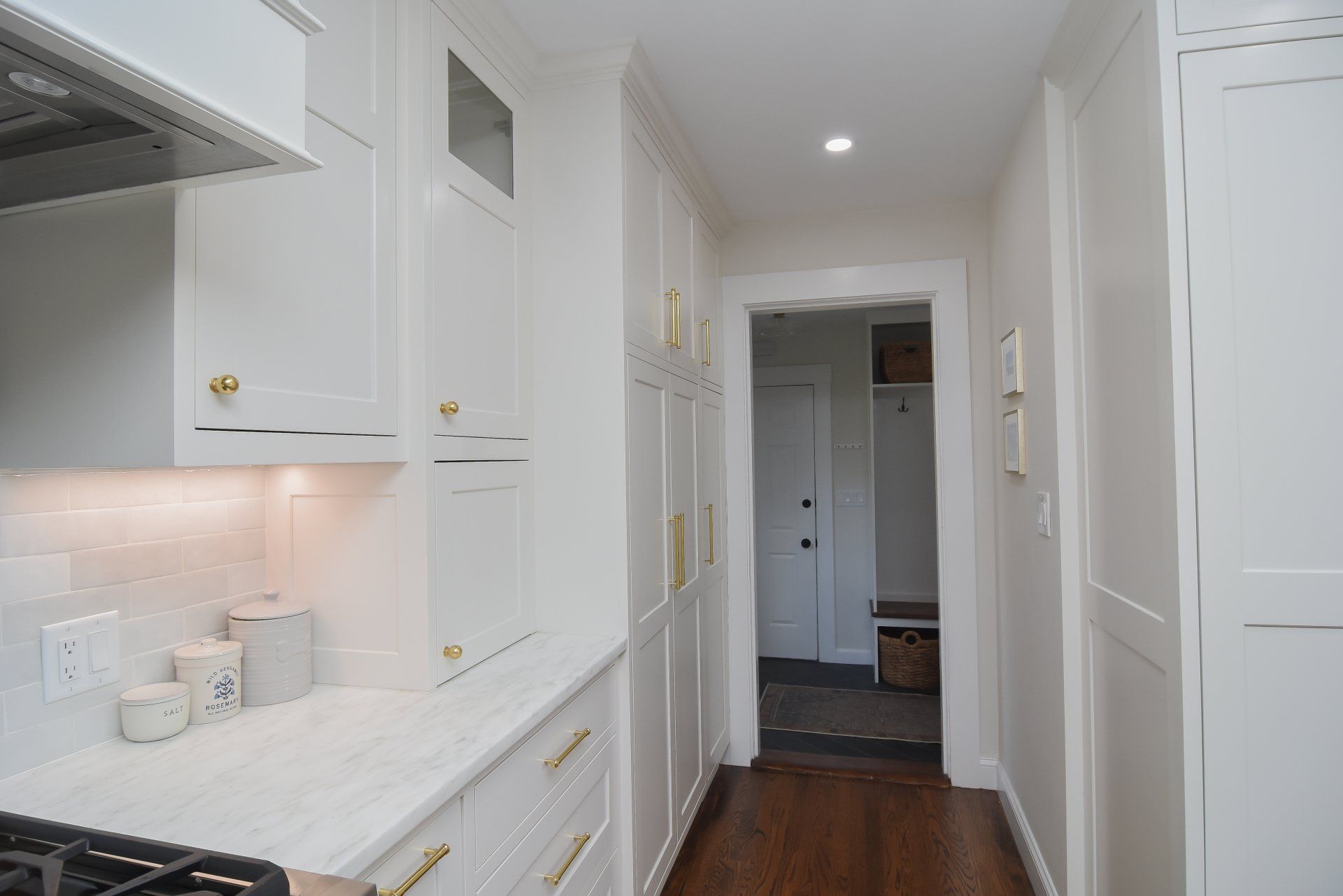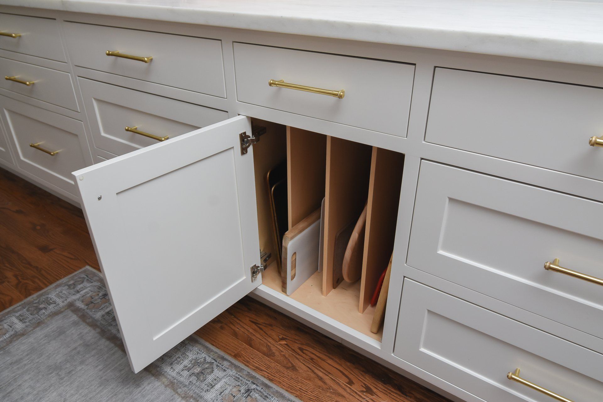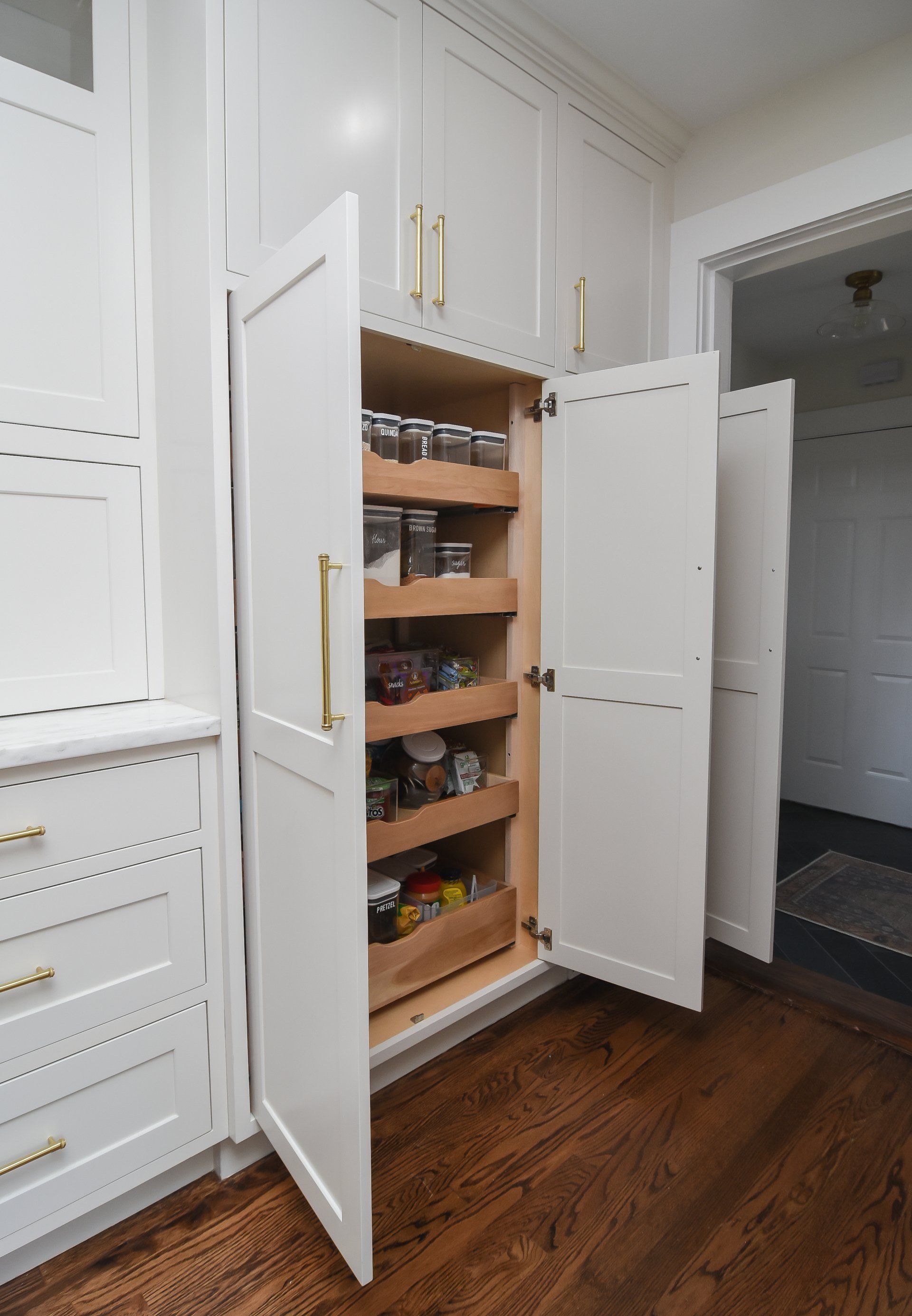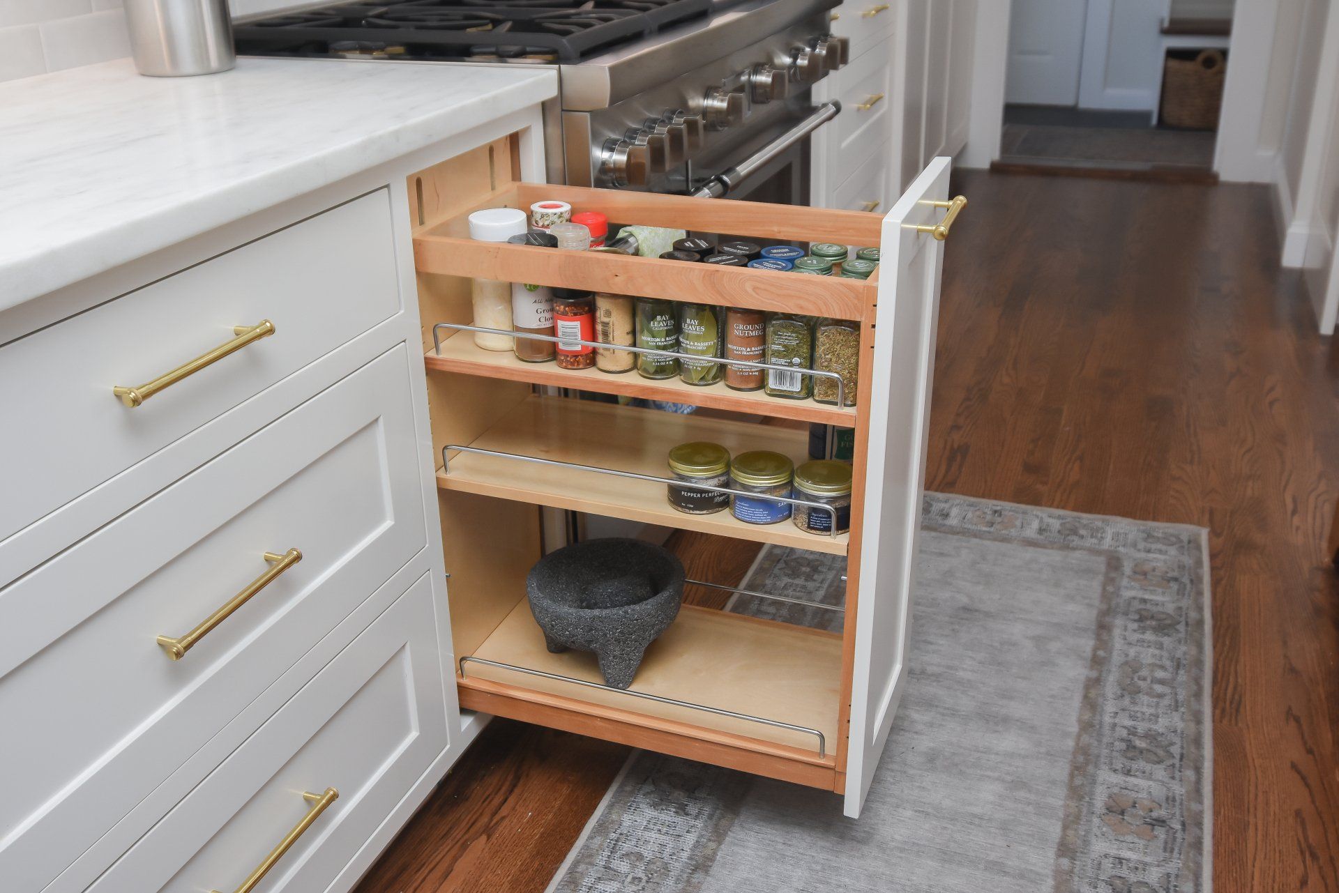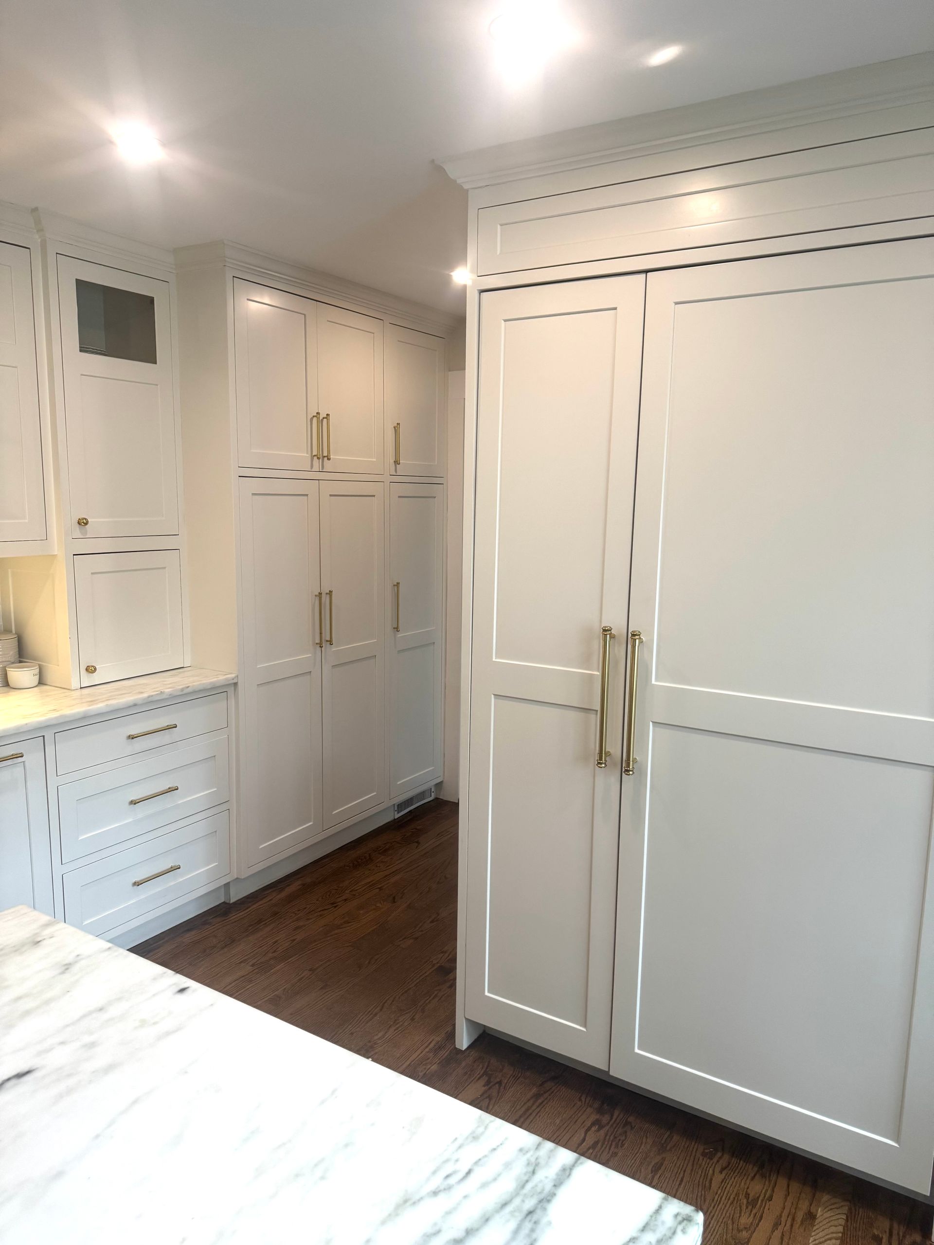 This kitchen has a long 22ft wall of cabinetry. Including a triple pantry, a beverage area, Large 12" Spice/Oil Pullouts on each side of the range, An extra deep drawer next to the prep-sink for Appliances, and a Glass Hutch near the fridge.