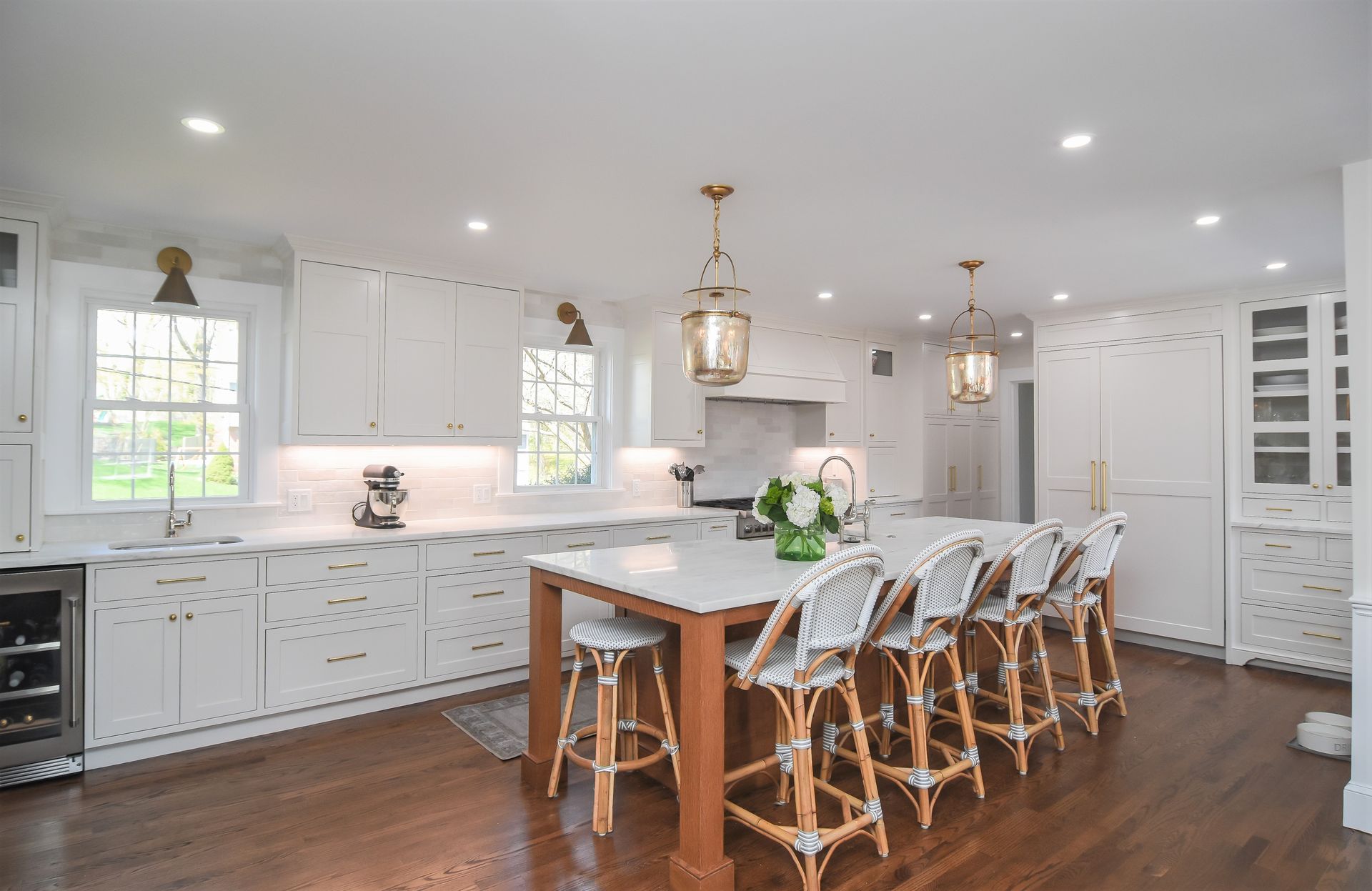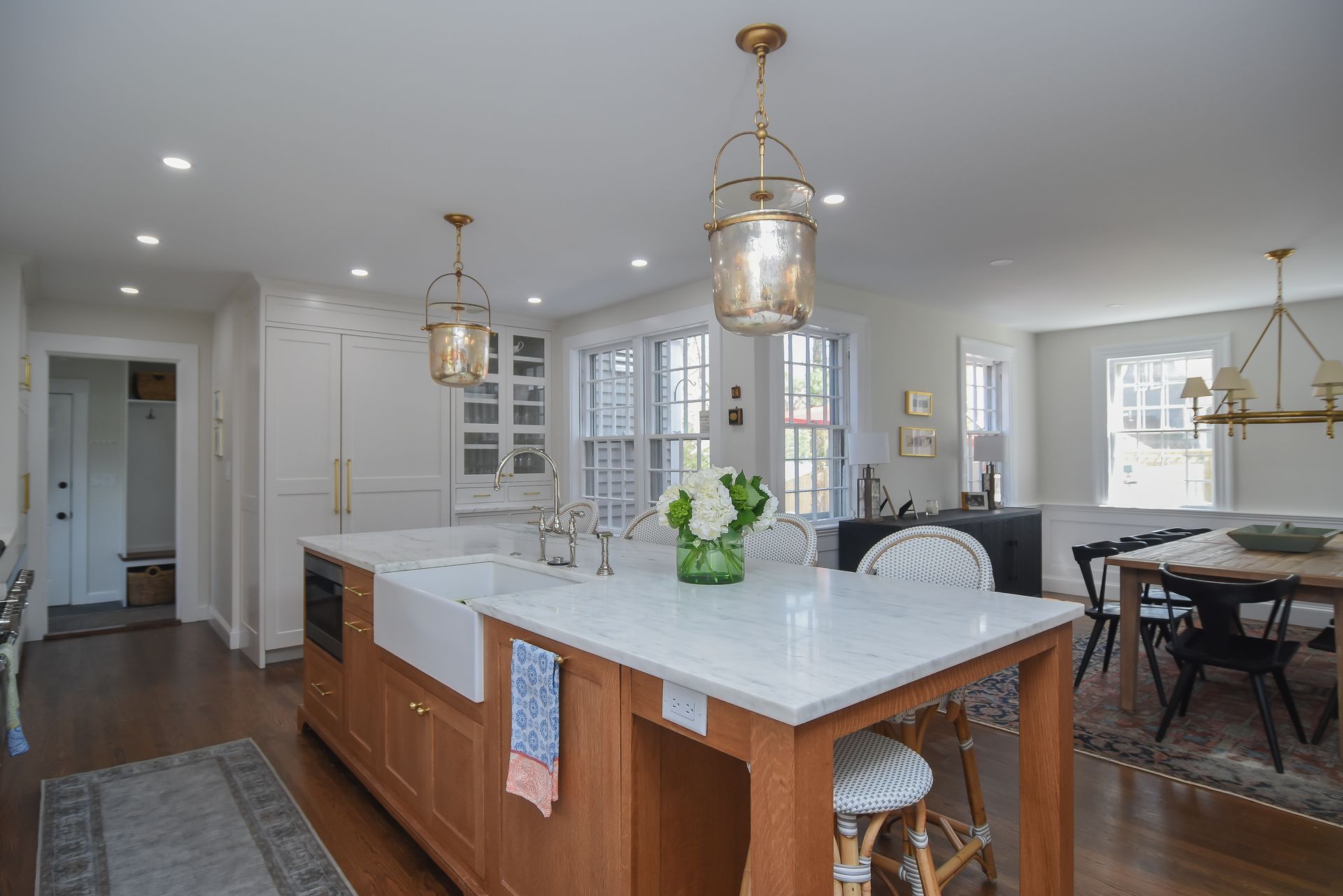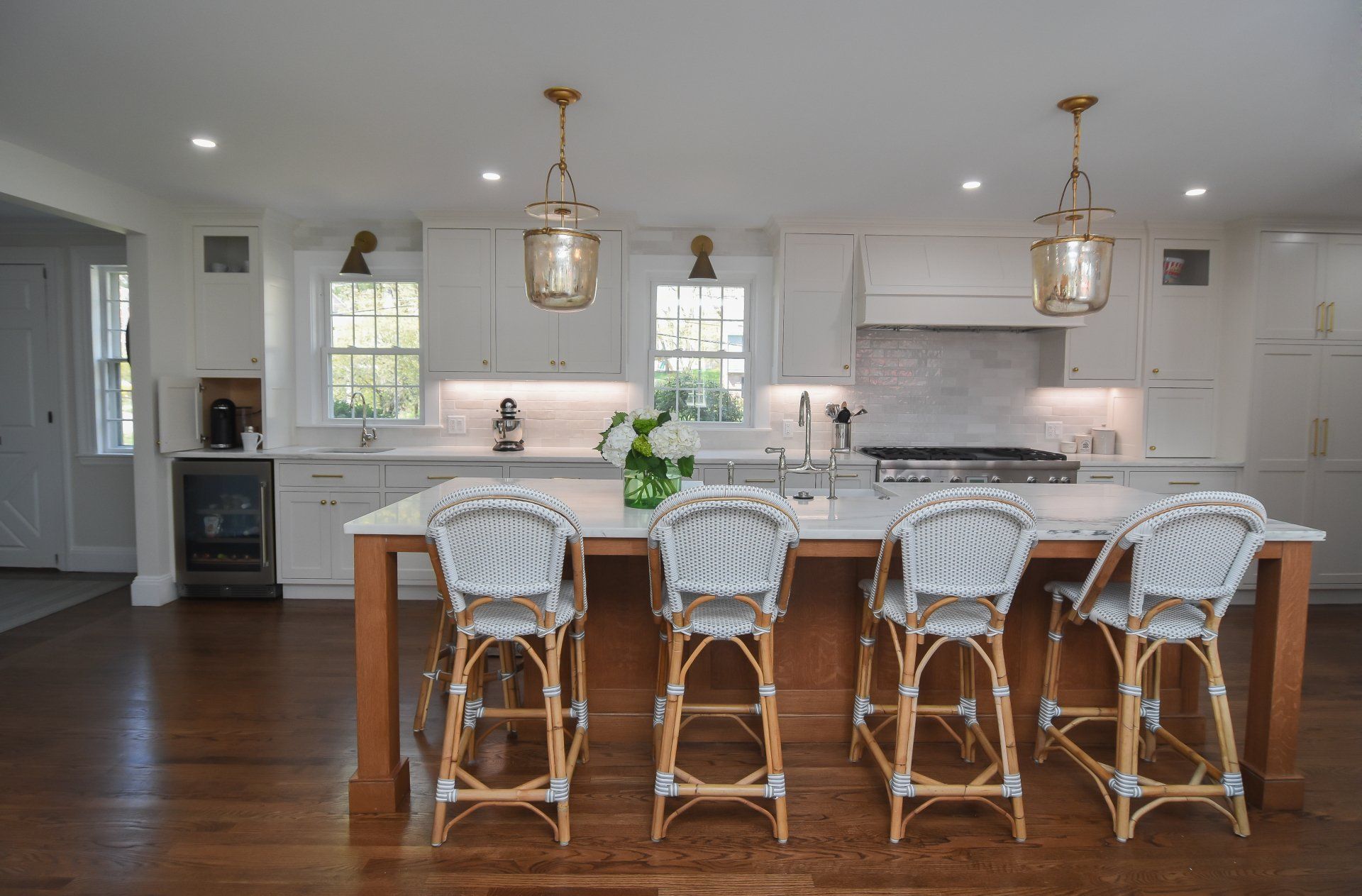 Golden Accented Hardware, Pendant Lights, Quarter sawn white oak island, with a light stain.