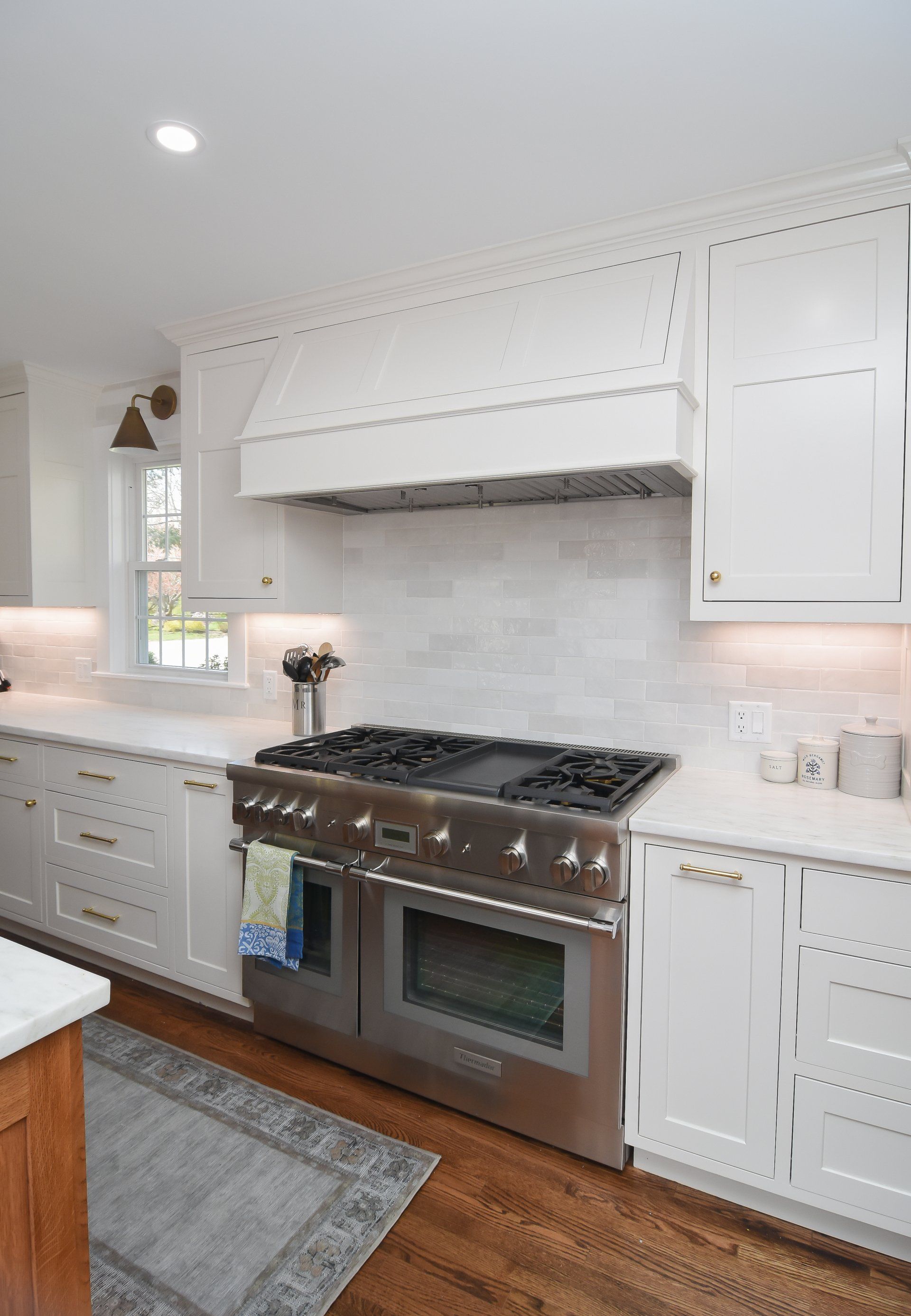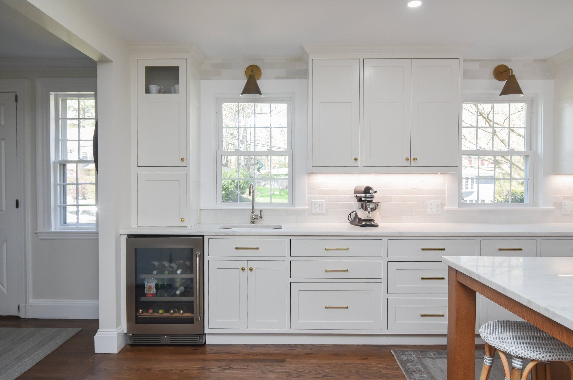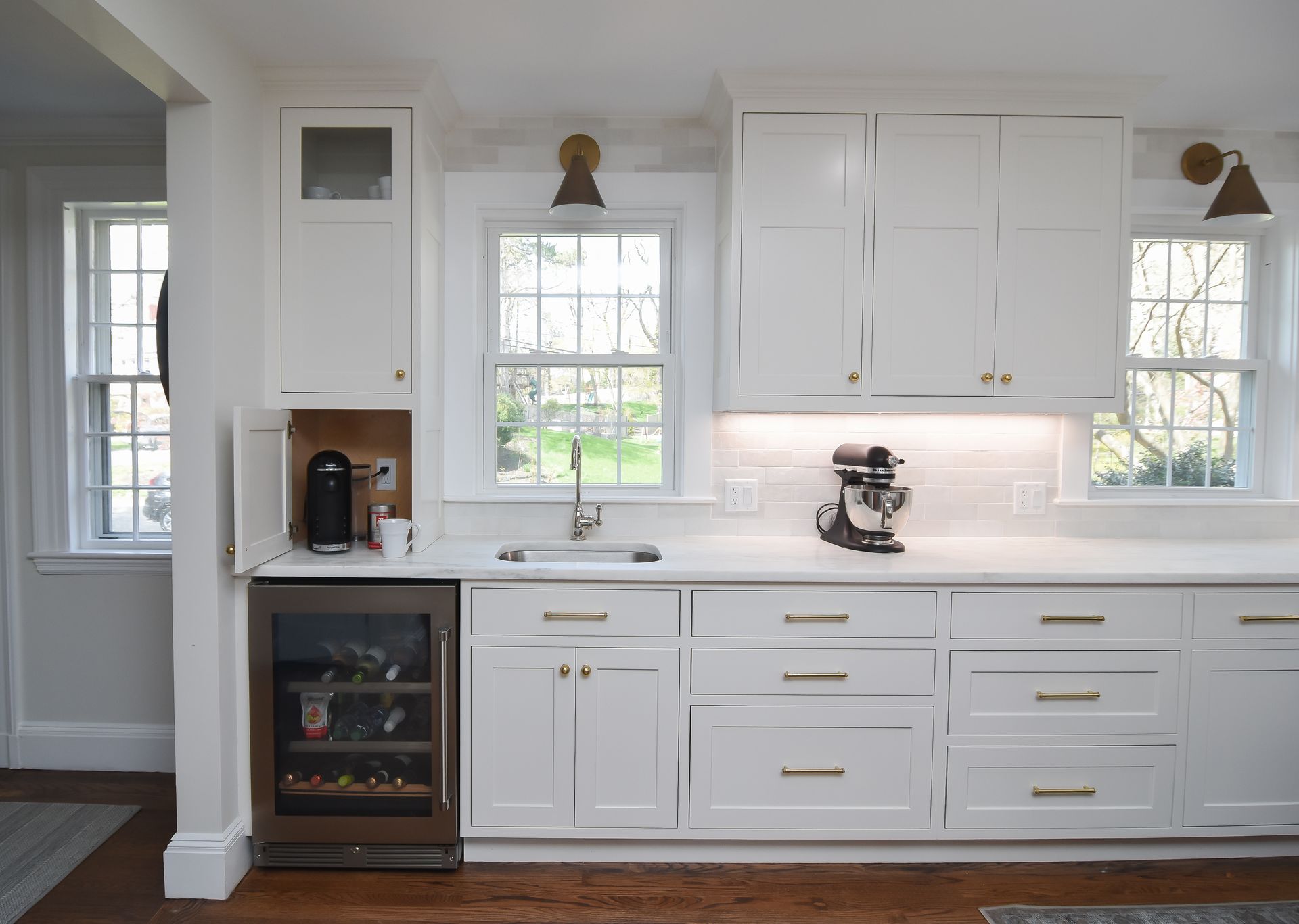 Golden Accented Hardware, Pendant Lights, Quarter sawn white oak island, with a light stain.
