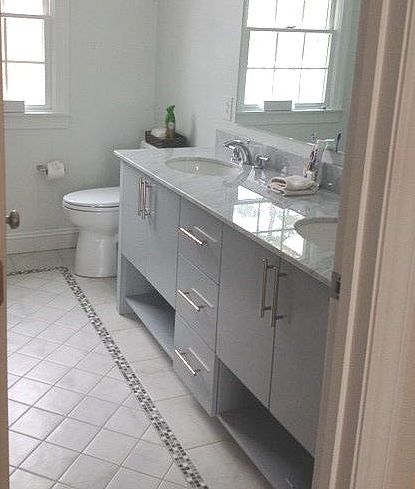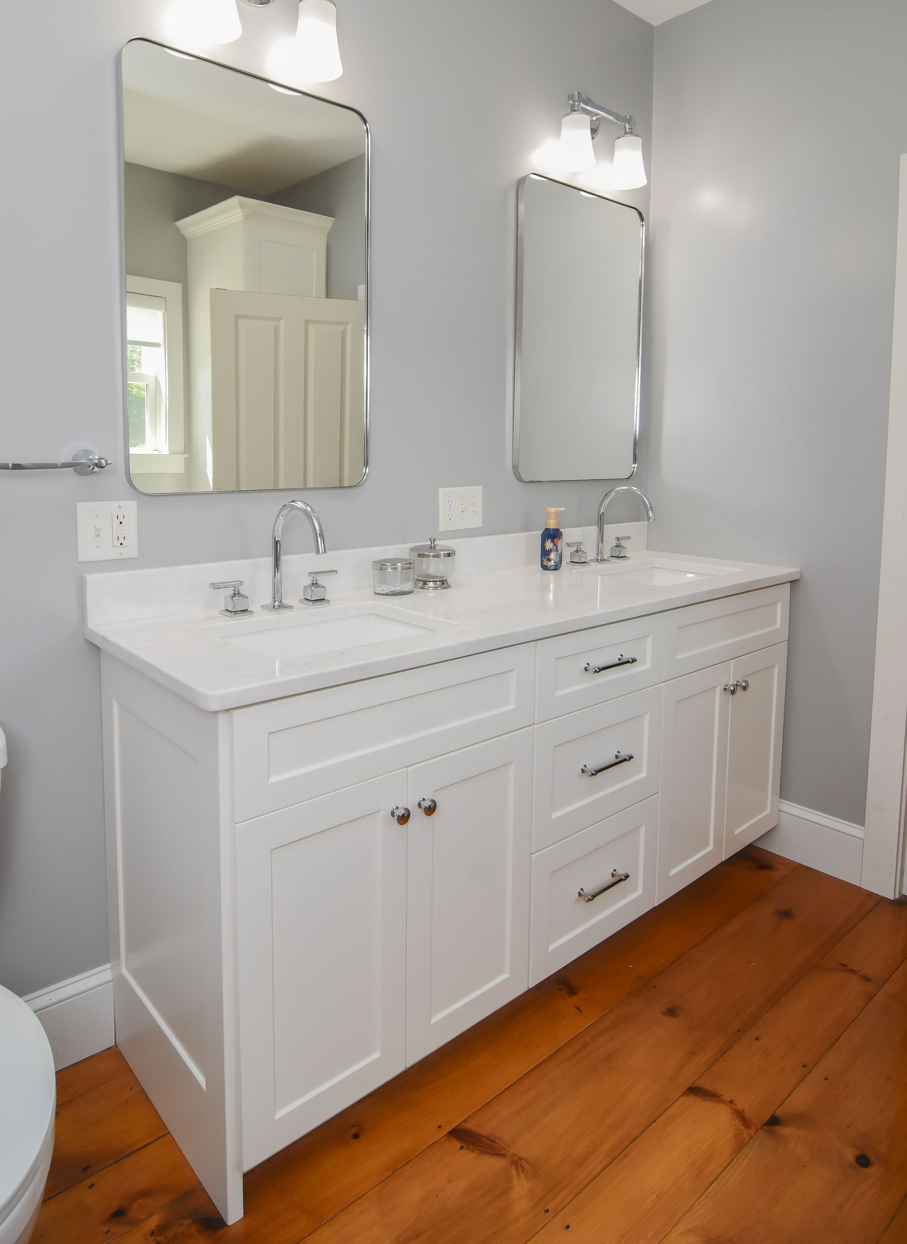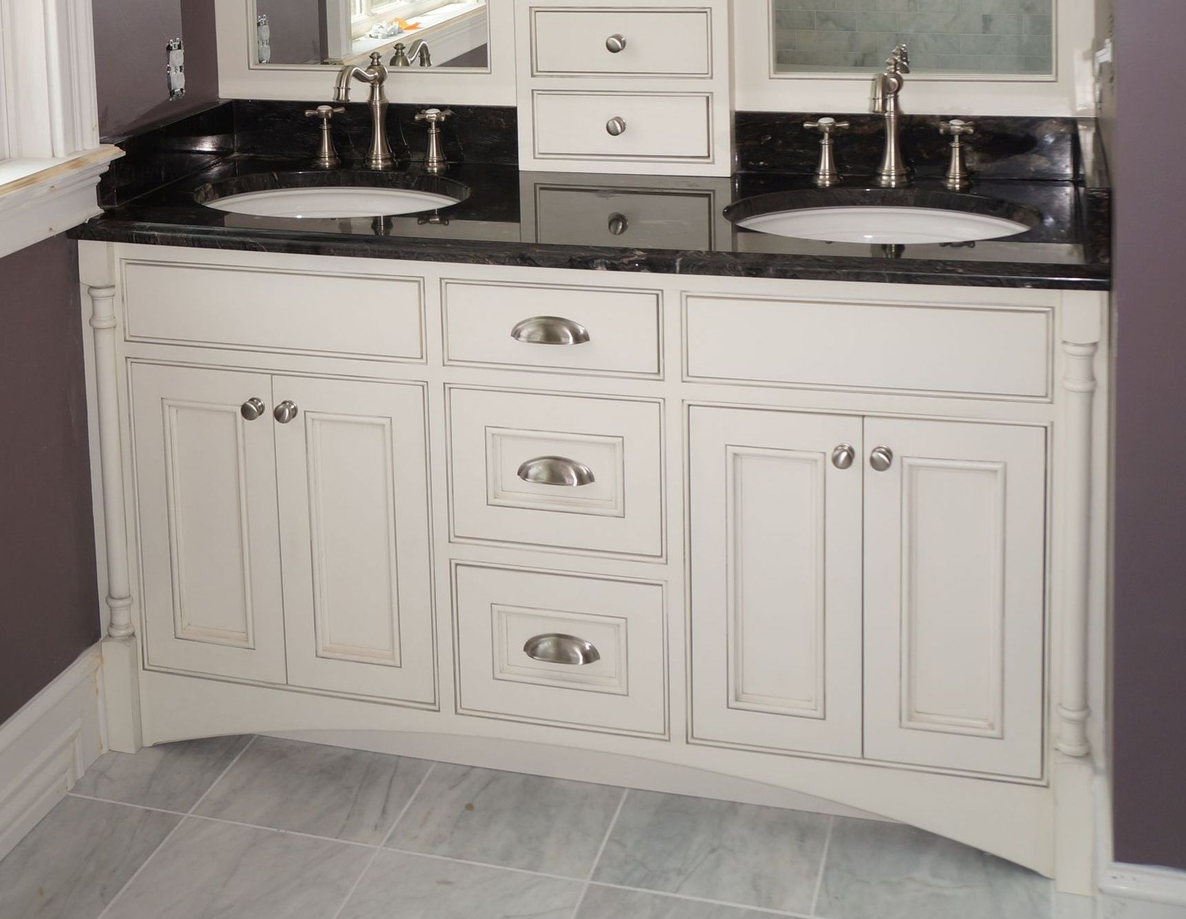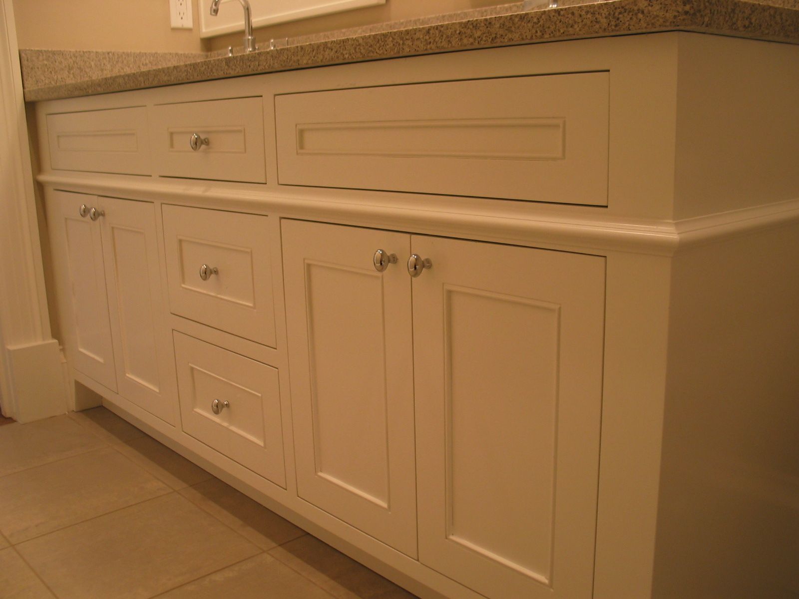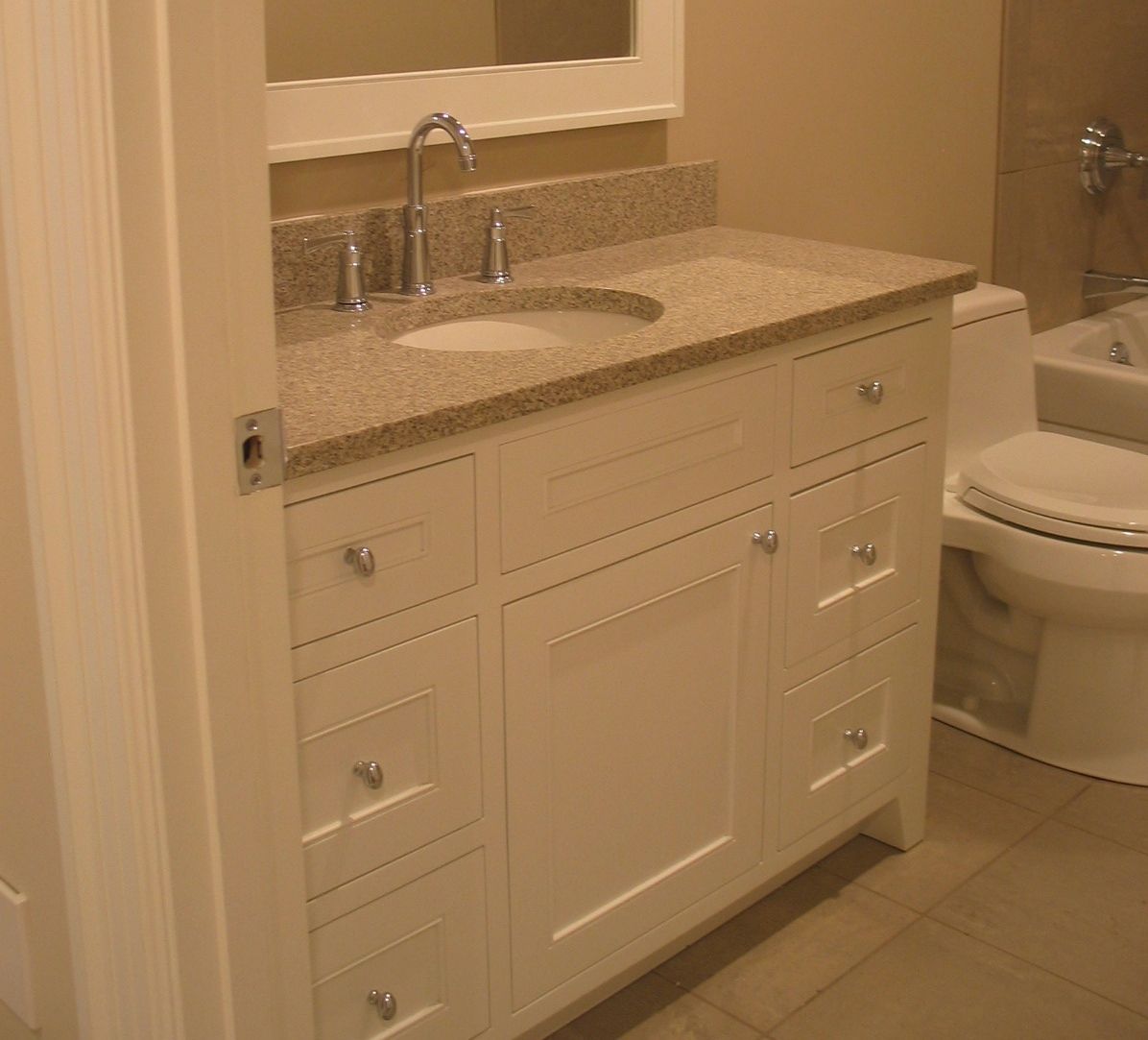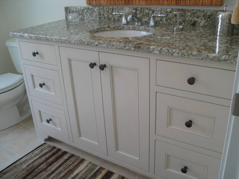 19. An Off-Center Sink Style Vanity. Inset style with Flat top drawers and shaker bottom drawers.