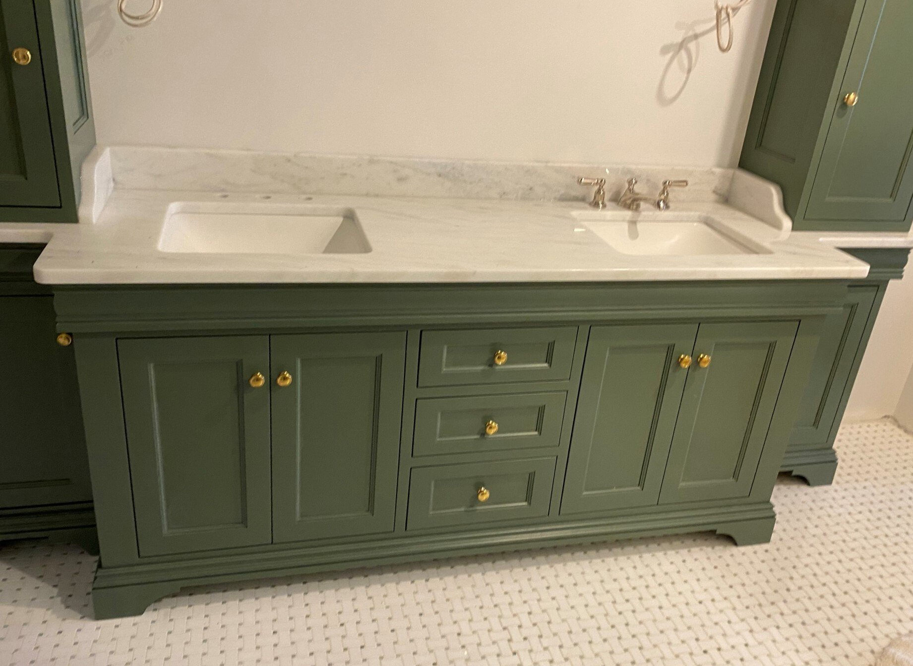 Top Molding Detail above the doors and a furniture style-baseboard bottom. Inset style and a linen cabinet on each side.
