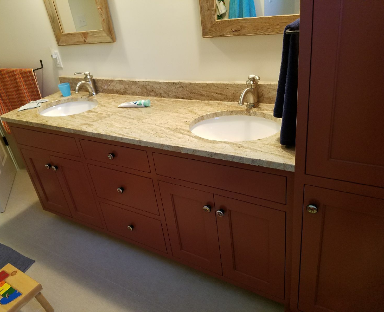 1. Flat Drawers, Inset style, Color to match nicely with the sinks.