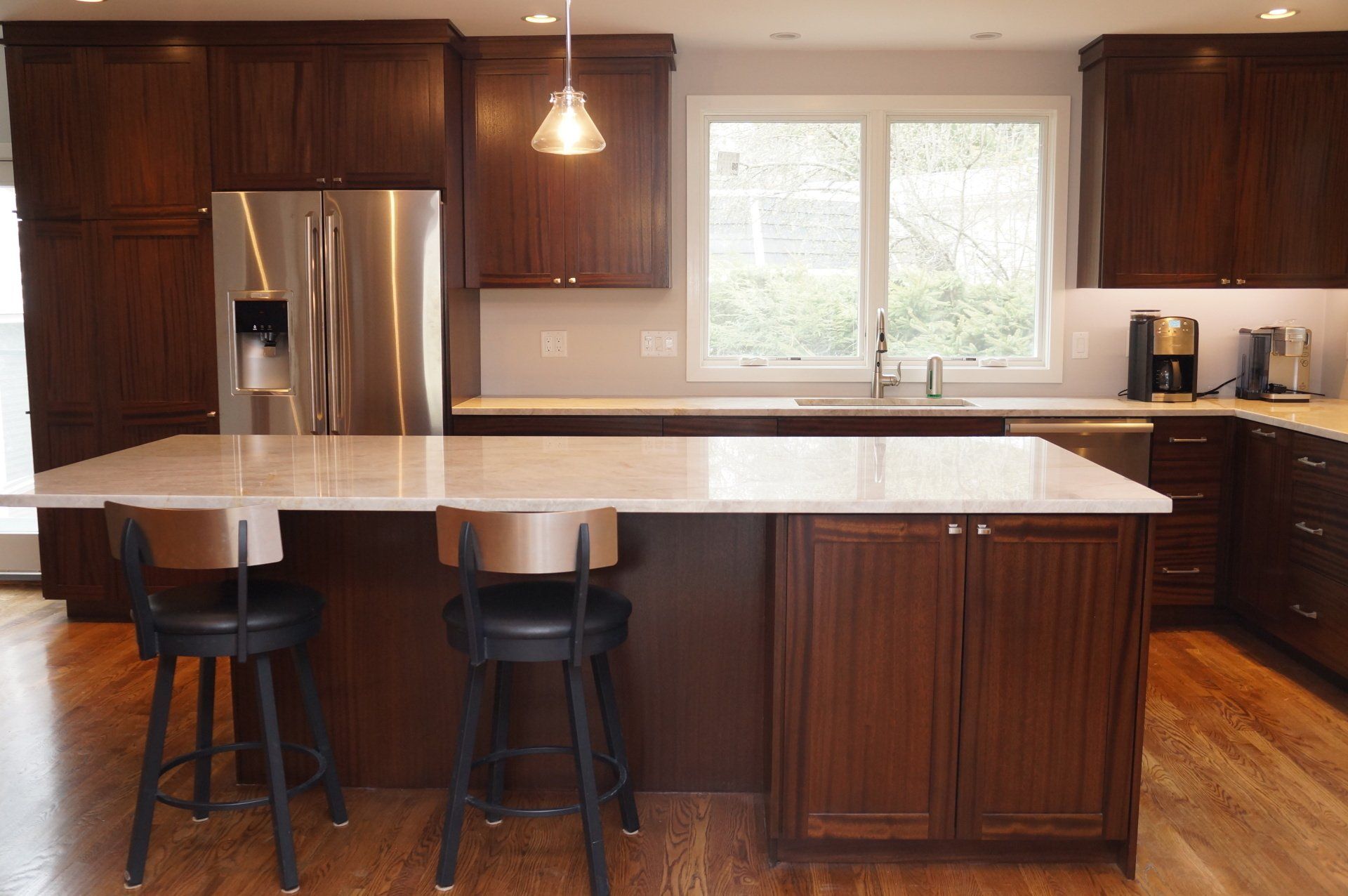 This Kitchen includes Stainless Steel Accents, such as doors, handles and stools.