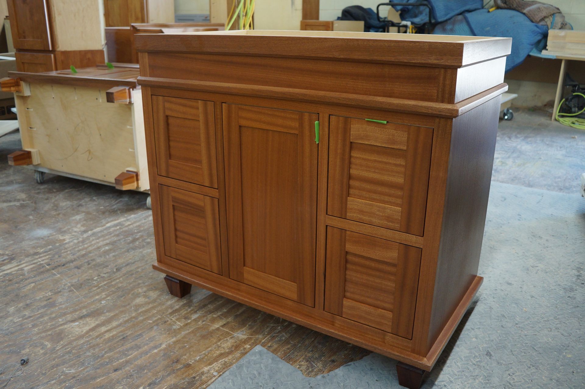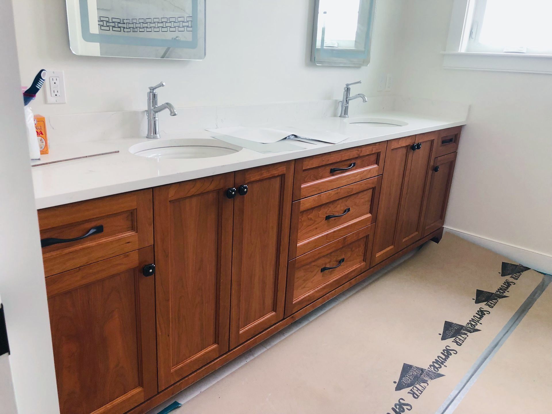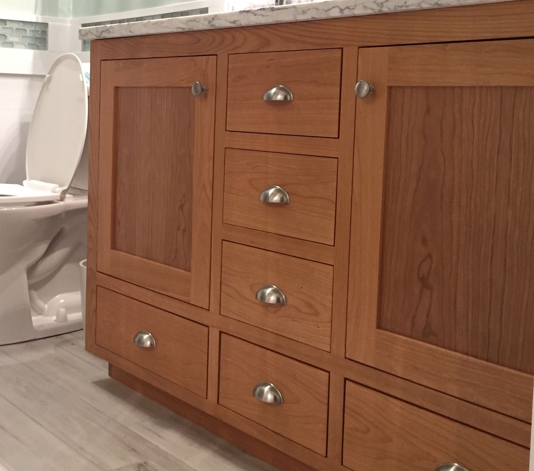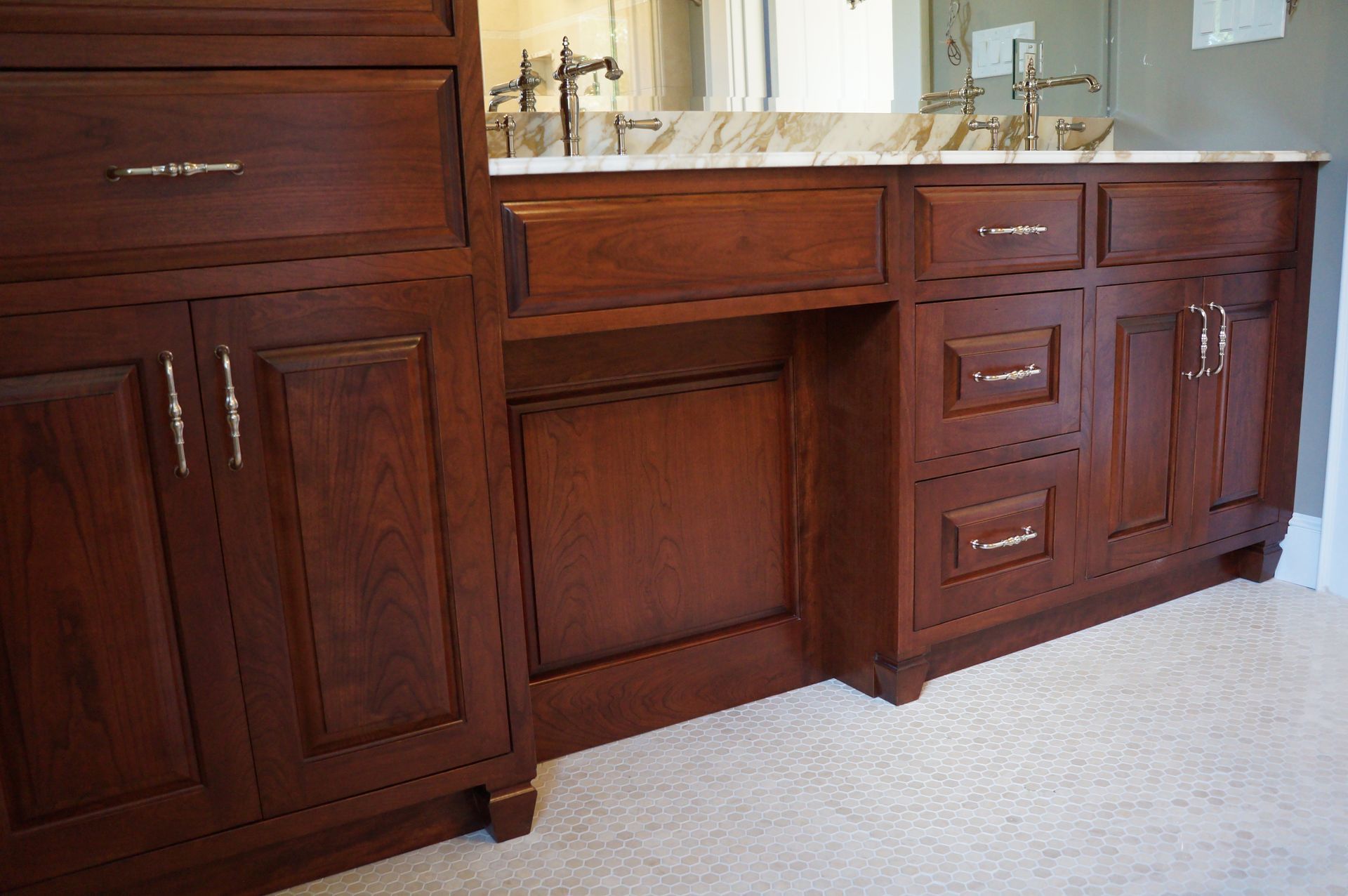 19. Handicap Accessible Vanity. Linen Cabinet with Laundry pullout. Raised Panel Door style, Stained Cherry wood.