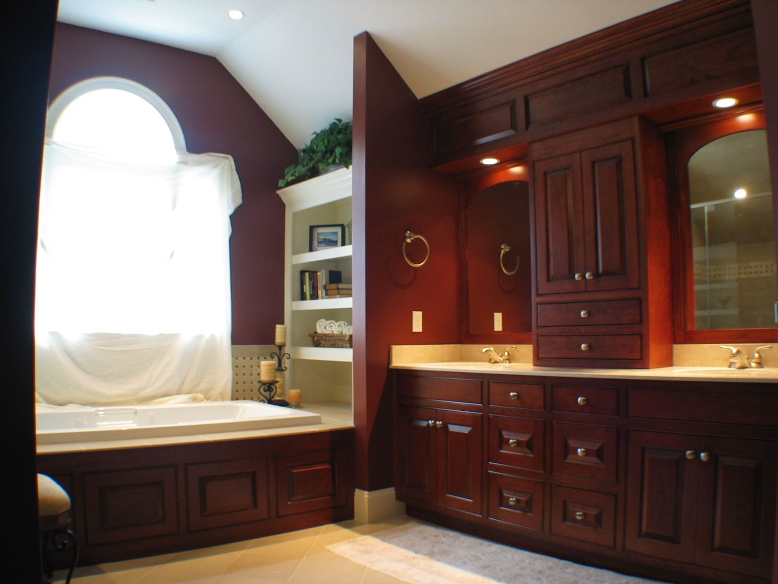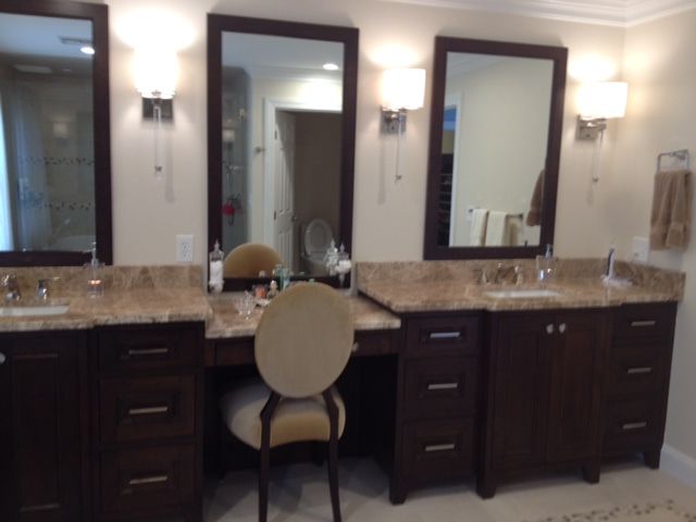 14. Dark Stained Cherry Vanity with Lit Soffit panels & Custom Mirrors. Raised Panel Doors, Inset Style.